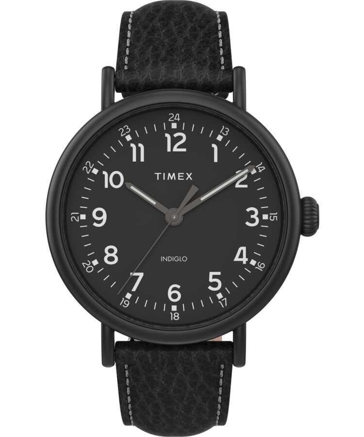 A rugged-meets-refined getup deserves a watch that has both in equal measure — enter the Timex Standard XL, featuring a beefy 43mm case and oversized crown, all done in bead-blasted brass with a handsome matte black finish. Clean, classic styling and easily interchangeable black leather straps as well, all the better to match with your jacket and boots.
