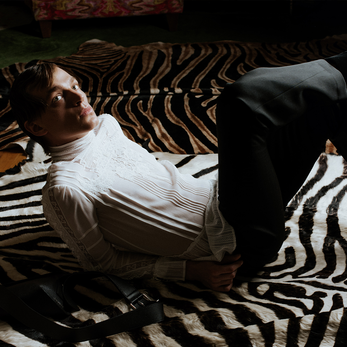 Shirt ($3,300), trouser ($1,260) and T-Bar Sling Bag ($2,400) by McQueen.