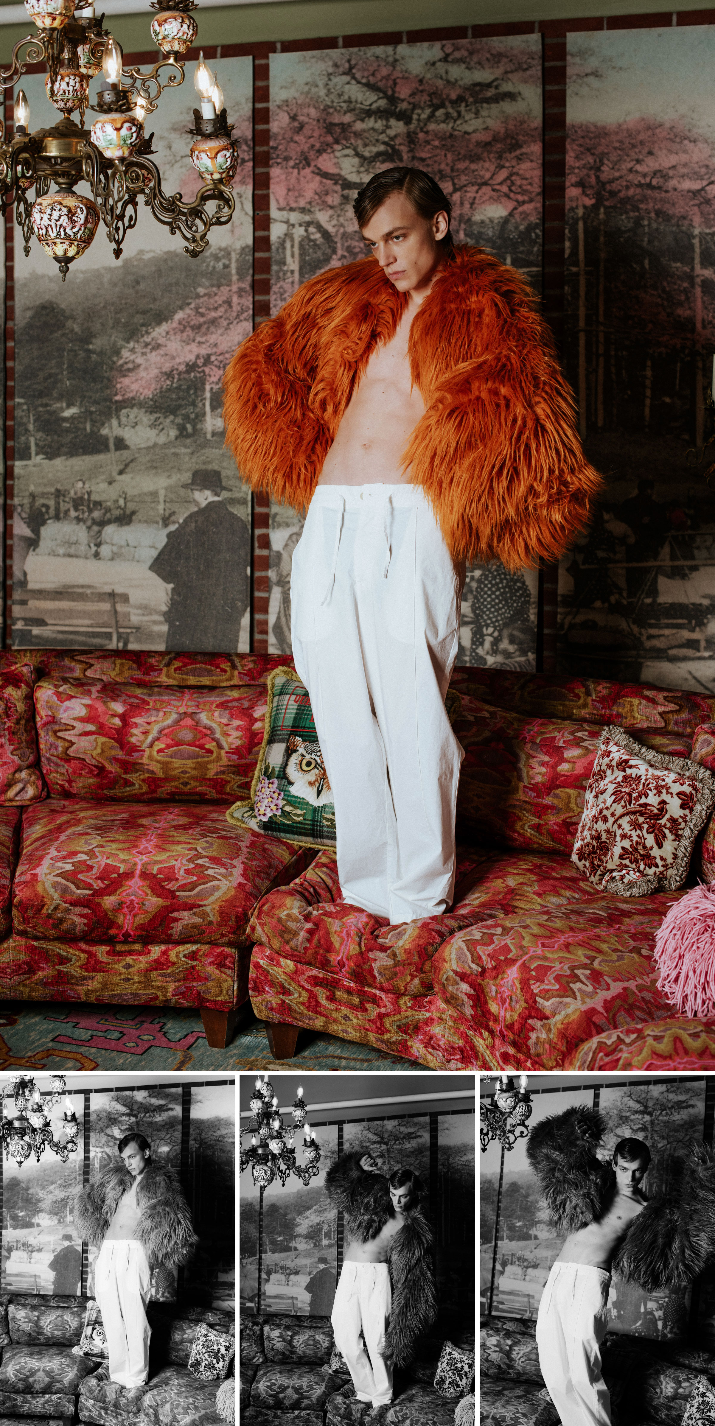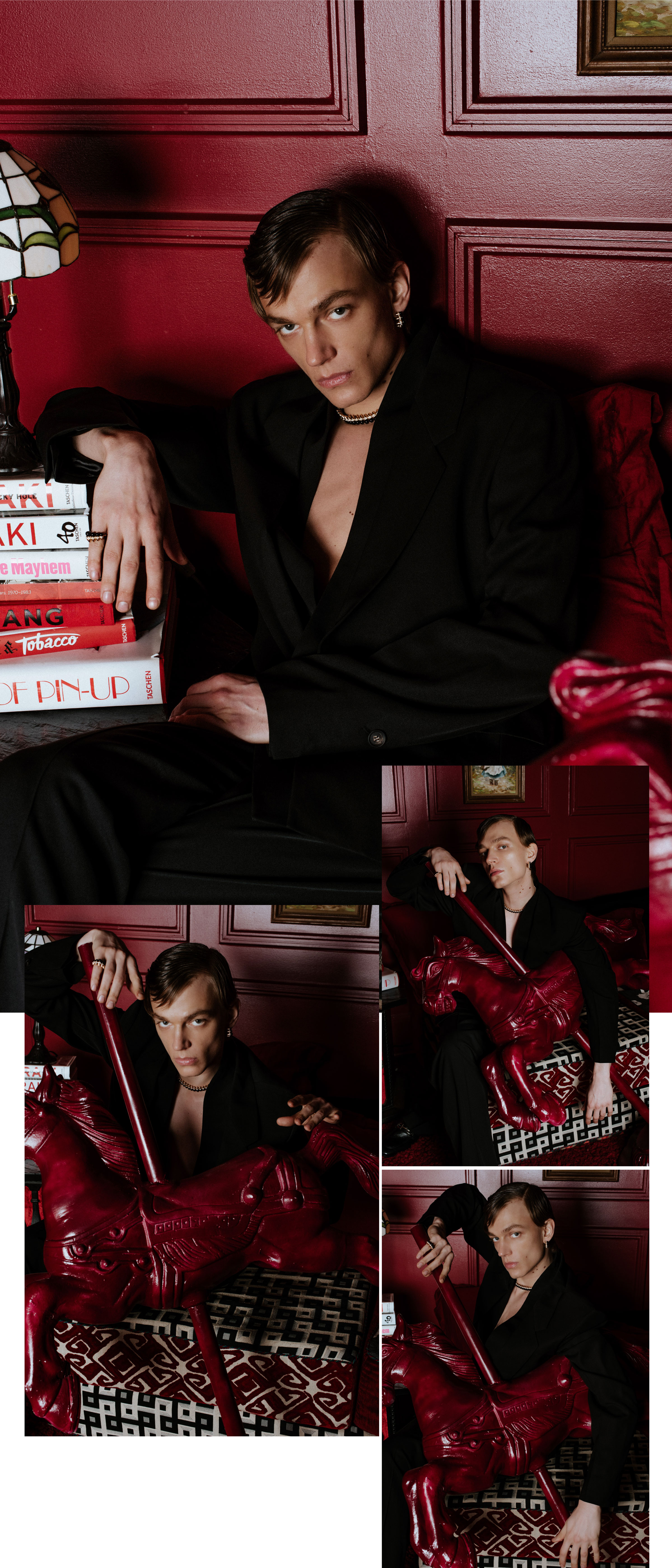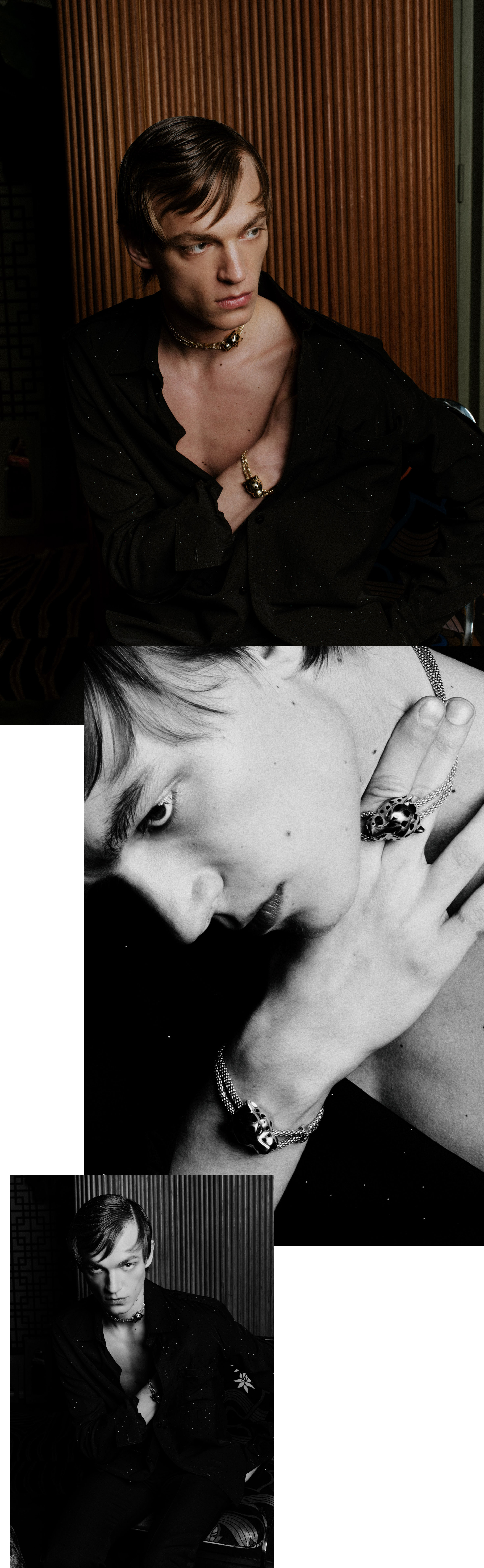 Swan Cravat (PUR) by Willy Chavarria; “Rose de Noël” clip featuring onyx and diamonds set in 18k yellow gold ($18,500) and “Perlée couleurs” ring featuring onyx and diamonds set in 18K yellow gold ($7,950) by Van Cleef & Arpels; Double Breasted Linen Jacket ($3,045) by Dolce & Gabbana; Jeweled Mariner Trouser ($817) by Bluemarble.