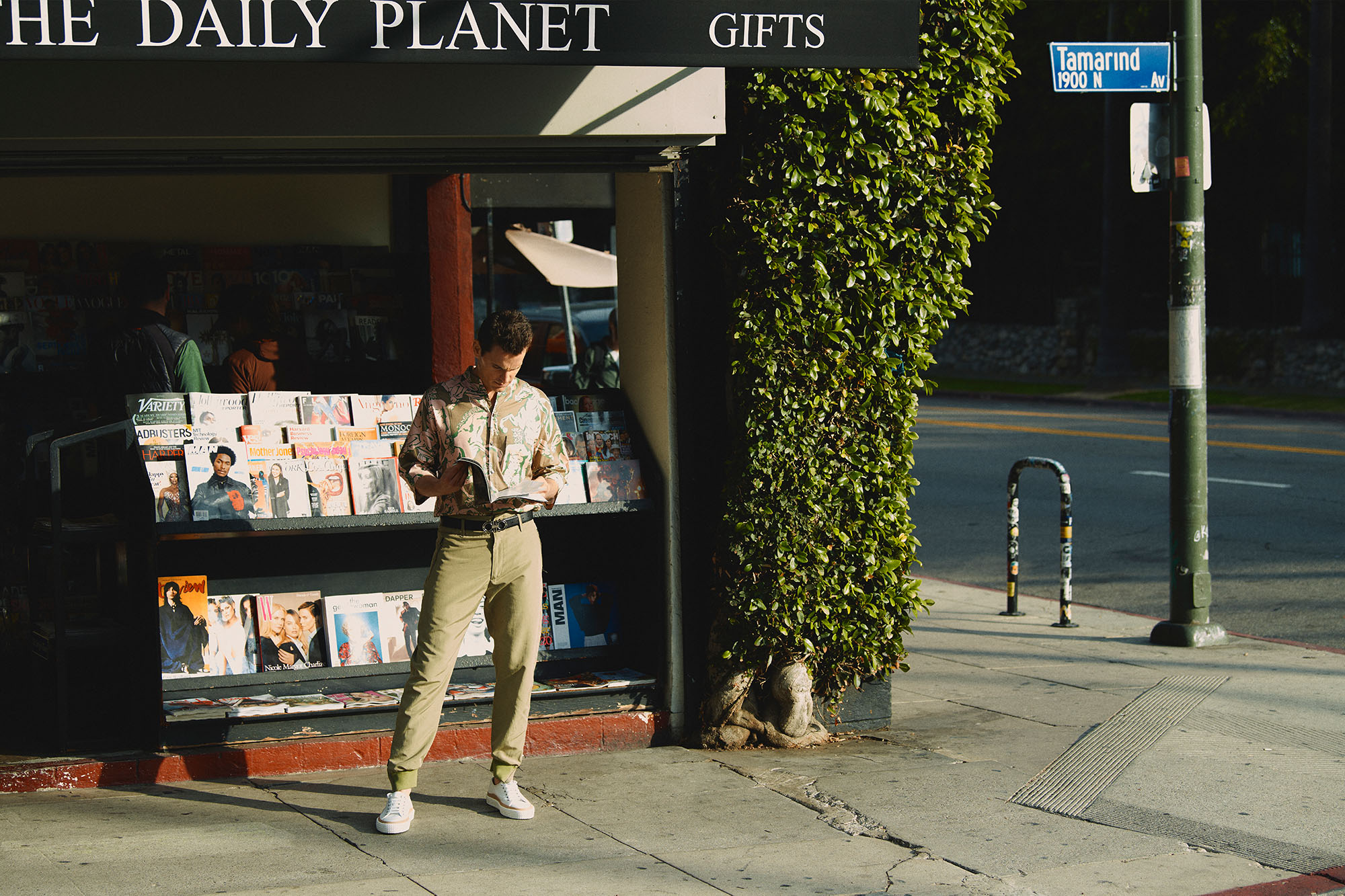 When it comes to a casual getup for kicking around the neighborhood, Bomer’s Salvatore Ferragamo ensemble fits the bill nicely. “I love the color of that shirt,” he says. “It does seem more and more like there are these looser, off-the-shoulder fits that are such a callback to the ’90s, which I think is really fun. And I think clean white sneakers are a great way to just round out any outfit in L.A. That’s one of the things I love about it here, you can pretty much wear clean white sneakers anywhere.”