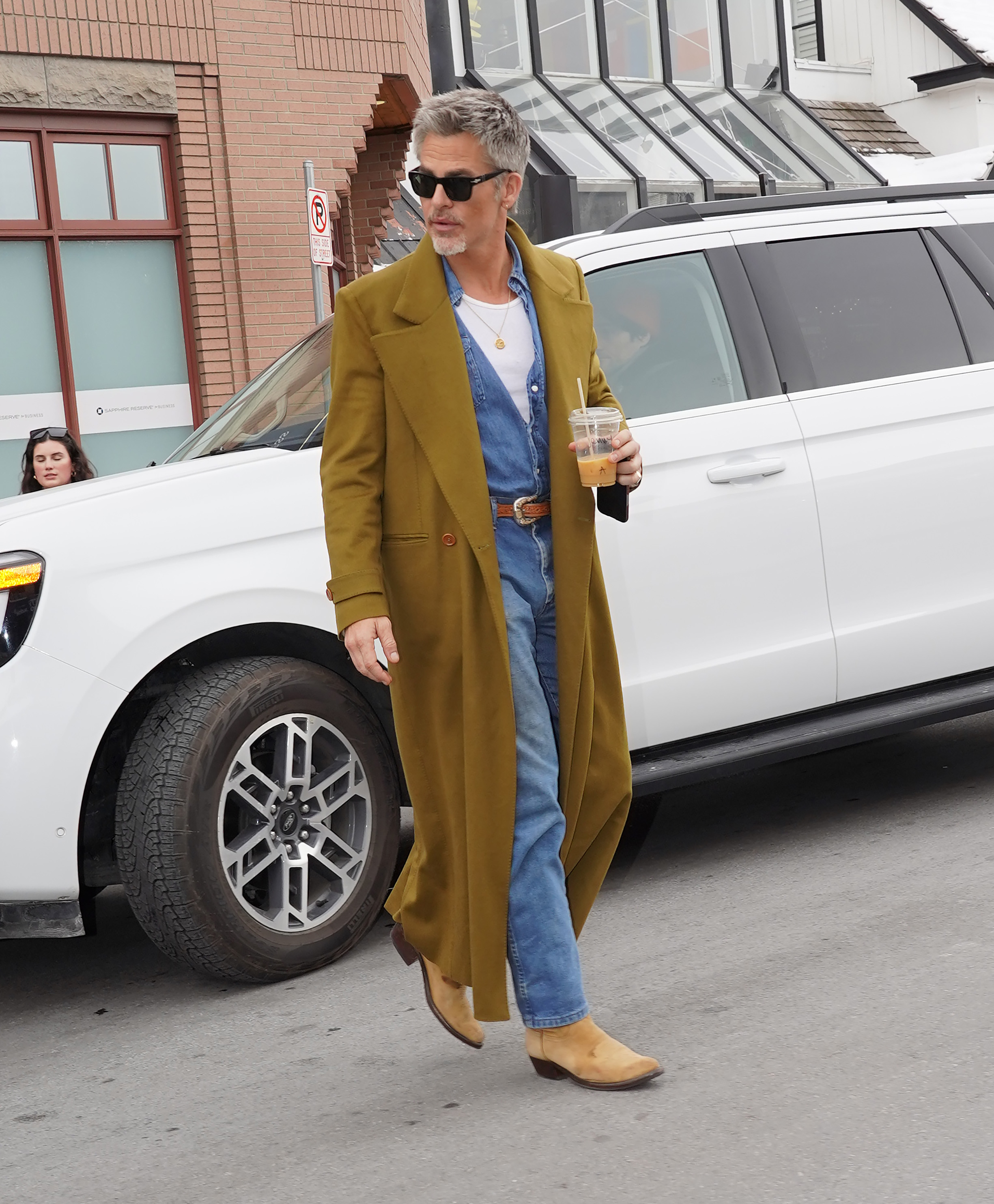 Chris Pine doing his best Robert Redford impression in double denim, suede boots and a damn fine trench.