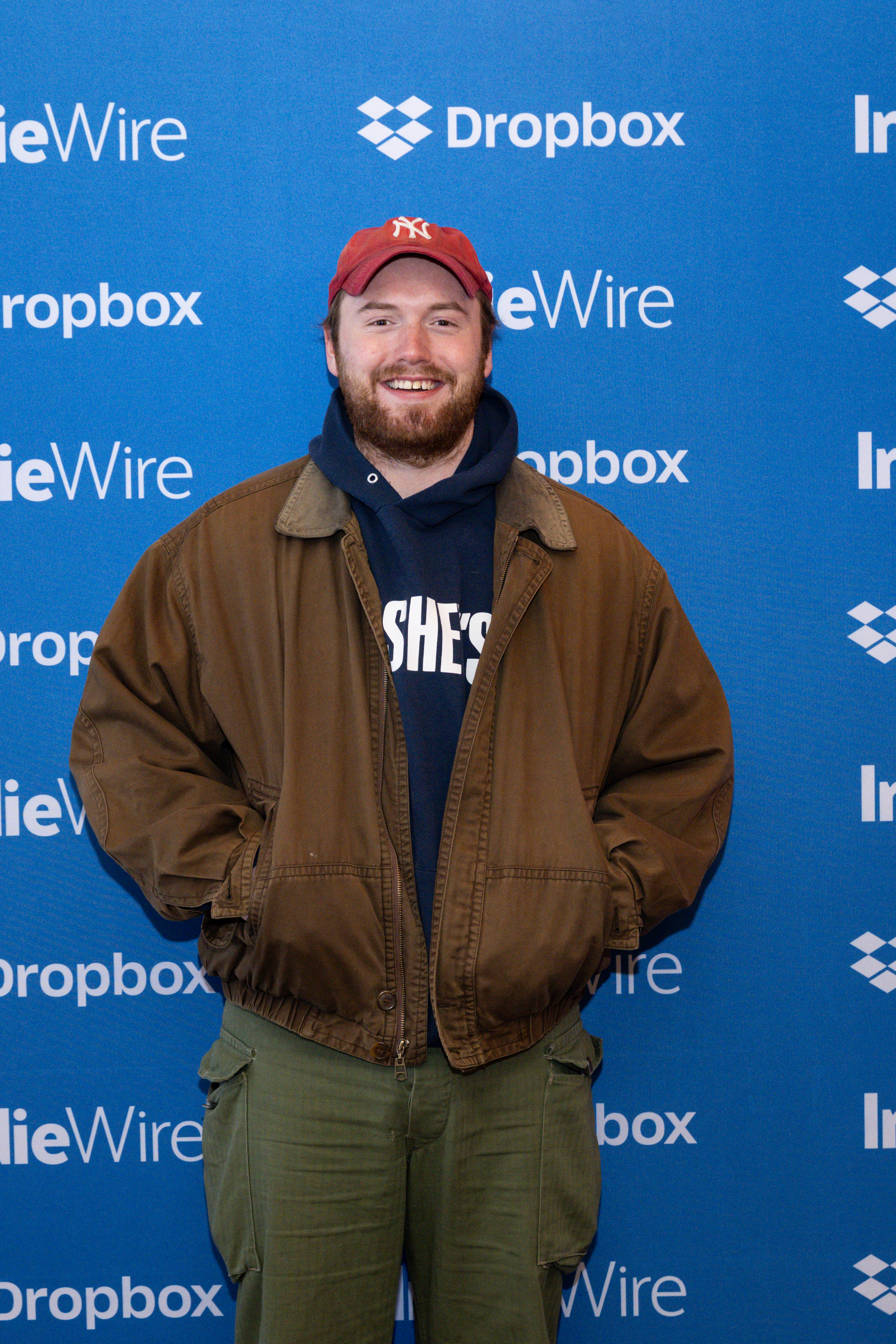 Beat-to-shit workwear jacket, cargo pants, Hersey’s hoodie and an off-color Yankees cap? Cooper Hoffman with the serious blue-collar cosplay.