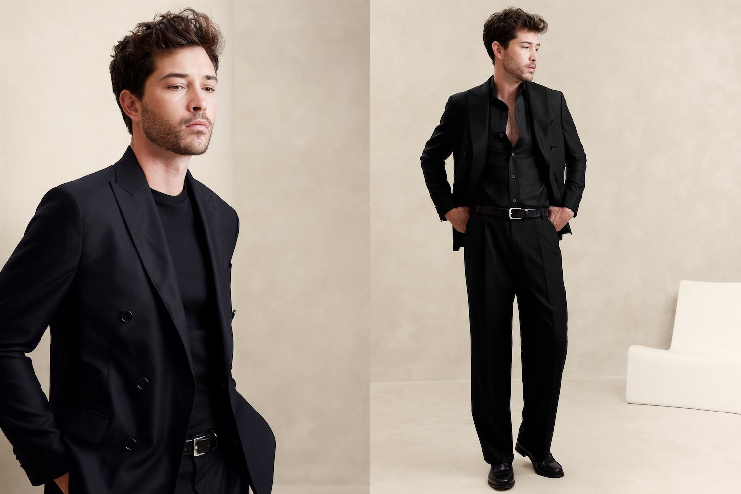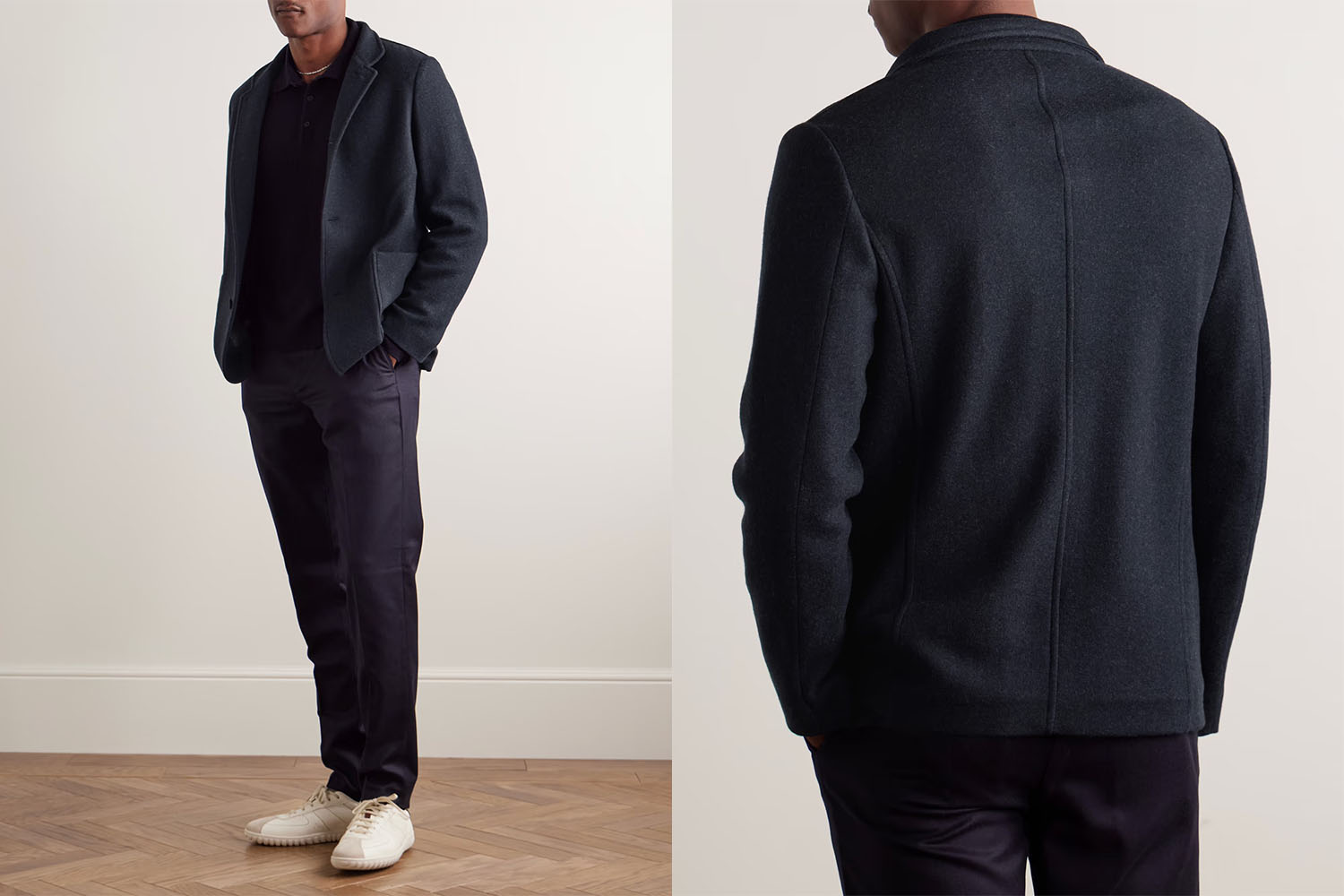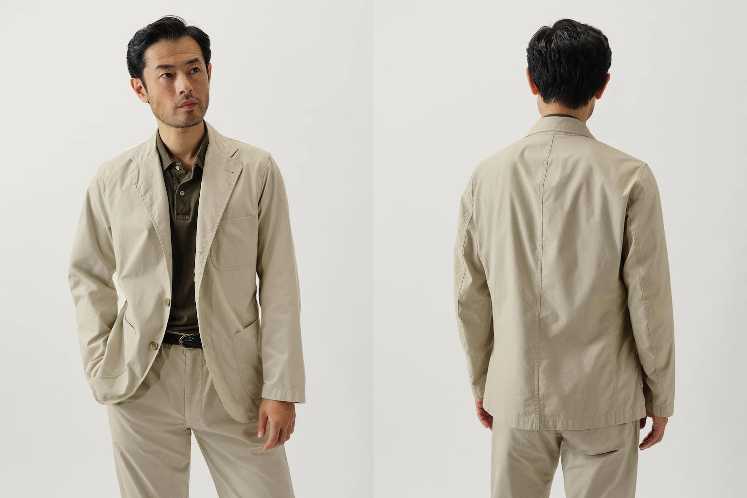 However, hopsack isn’t the only fabric keeping suits fresh for travel. In the past decade, a bevy of suit suppliers have taken it upon themselves to release “jetsetter” lines, which often feature “unstructured” or “unconstructed” blazers with innovations focused on breathability and stretch. These jackets feature unpadded shoulders, little or no lining, and a lightweight technical blend, which can range from wool or cotton to nylon. Much like athleticwear, these jackets often feature a minuscule percentage of a stretching agent, like elastane, to help better retain shape and extend the range of motion.