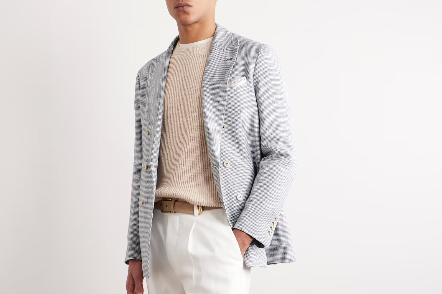 Quite luxury? Never heard of her. A summer of grand plans demands a linen suit to match, and an ultra-luxe puppytooth double-breasted jacket from Italian craftsman Brunello Cucinelli is just what the yacht captain ordered. Remember, the prerogative here is bold — leaning into stark separates and brazen displays of wealth (read: Loro Piana boat shoes) is, if anything, encouraged, especially when the Mediterranean is involved.