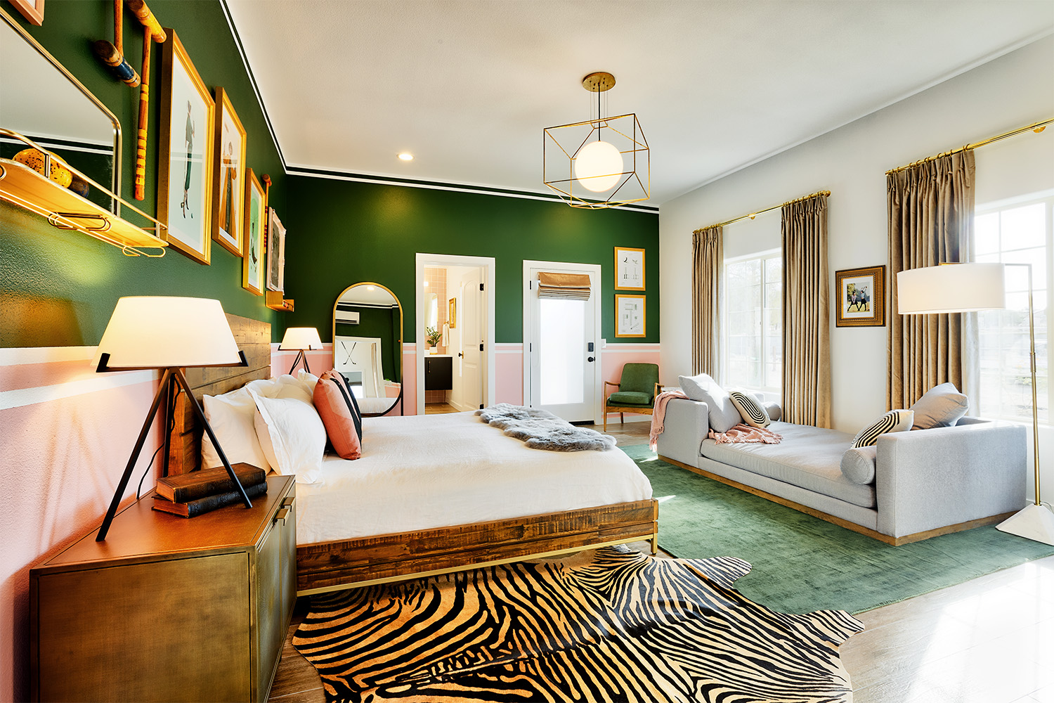 Joshua Tree Country Club (JTCC) is not your average rental. Here, the level of design, attention to detail, and high-end finishes are more in line with what you’d find in an aesthetic-minded hotel, like those from Proper or Ace. Leaning into its country club theme, the whimsical yet refined interiors boast colorful, custom paint jobs and wallpaper topped with a mix of vintage sporting equipment, black-and-white desertscapes, and the photographs by Slim Aarons. All in all, the money and attention spent to make this something special is apparent.