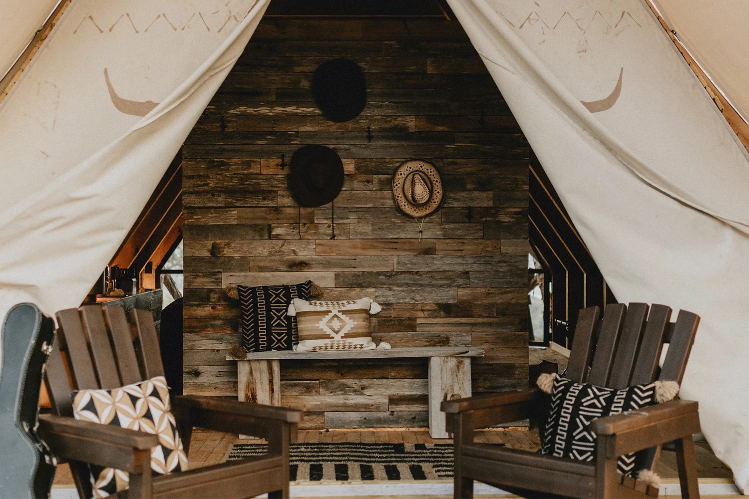 Located about an hour north of downtown Austin, Talula Mesa is the home of four air-conditioned tents — three large and one small — situated on 15 acres overlooking Lake Travis. The tents are spread out for privacy, and each offers scenic views, though the 300-square-foot Grand Aztec tent has the best sightlines to the lake, so you can start and end your day with great views. Outside the tents you’ll find hammocks, a small pool, and yard games like cornhole, bocce ball, and badminton. There’s also a yoga hut, should you want to align some chakras, plus kayaks and paddleboards that you can take down to the water.