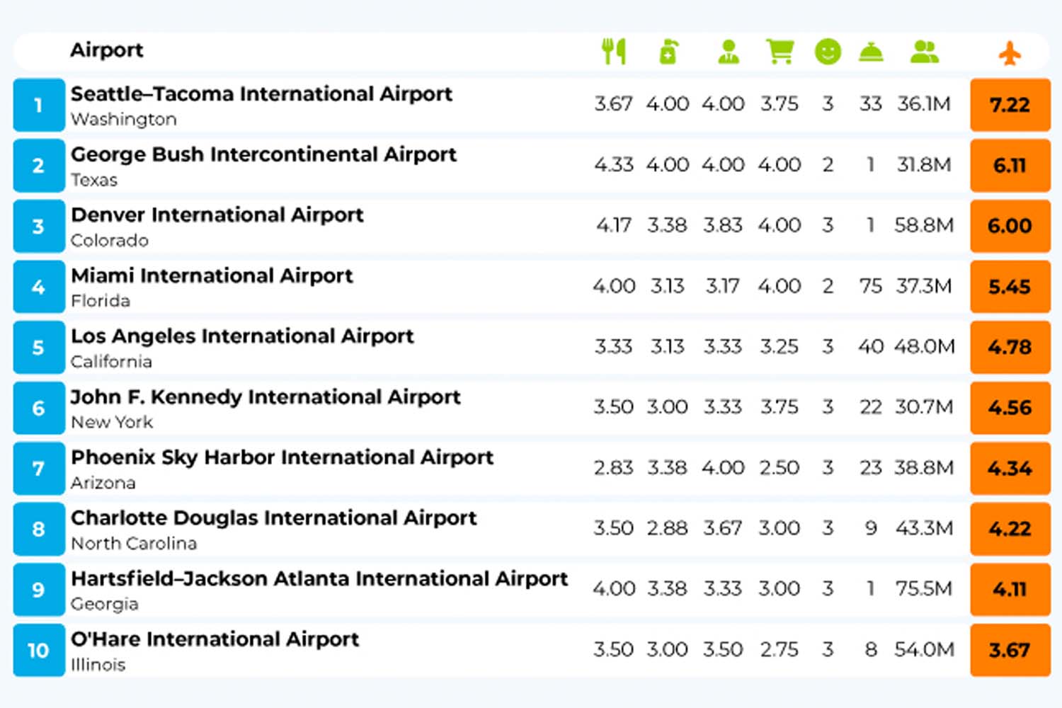 As a New Yorker, I concede that I was surprised to see JFK in the six spot…or on the list at all. And the fact that this study looked almost exclusively at busy airports means that some of the usual fan favorites, like Savannah Hilton Head, Hartford Bradley International Airport and even Indianapolis International Airport, were left out.