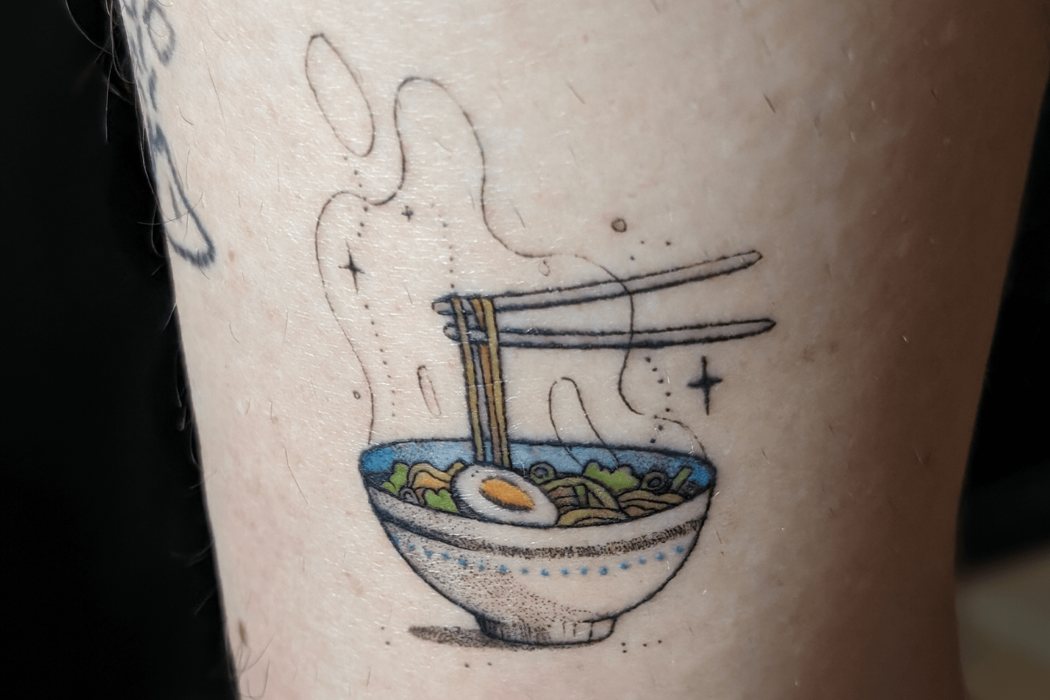 While the bulk of my tattoos are Very Serious Endeavors loaded with meaning I vow to cherish to the full lengths of eternity, I also have a few silly ones. For a small piece booked via a hotel, I decided to add to the latter inventory with a bowl of ramen a la the noodles emoji on my lower left leg. You don’t choose the noods life. The noods life chooses you.