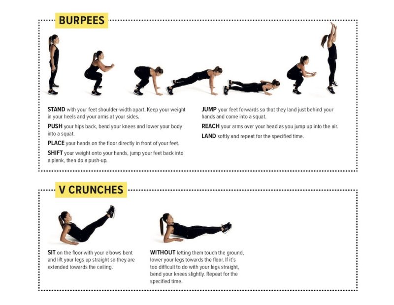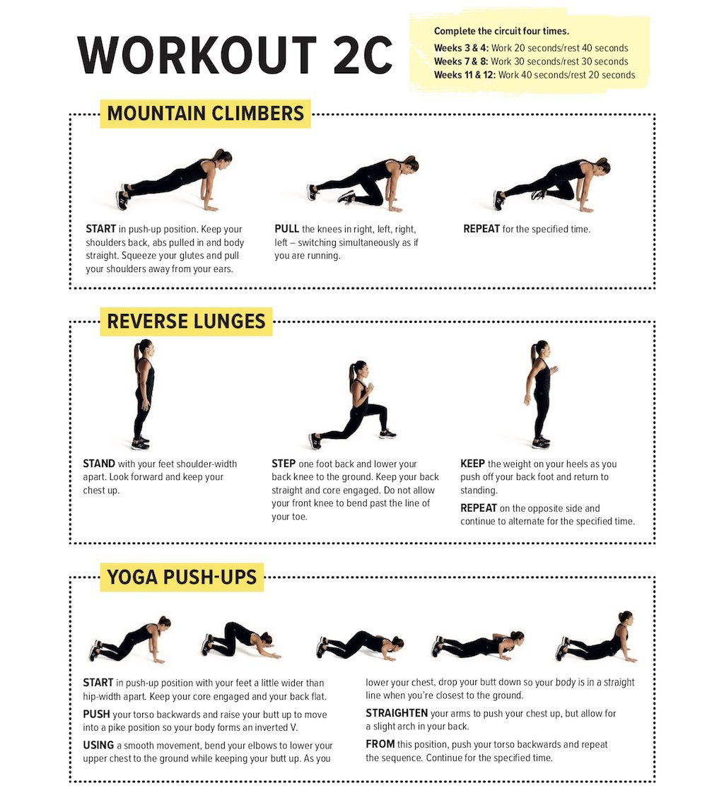 Complete this five-exercise circuit four times over 20 minutes, with each exercise taking one minute. For an easy workout, work for 20 seconds, rest for 40. For average, work for 30 seconds, rest for 30. For hard, work for 40 seconds, rest for 20.