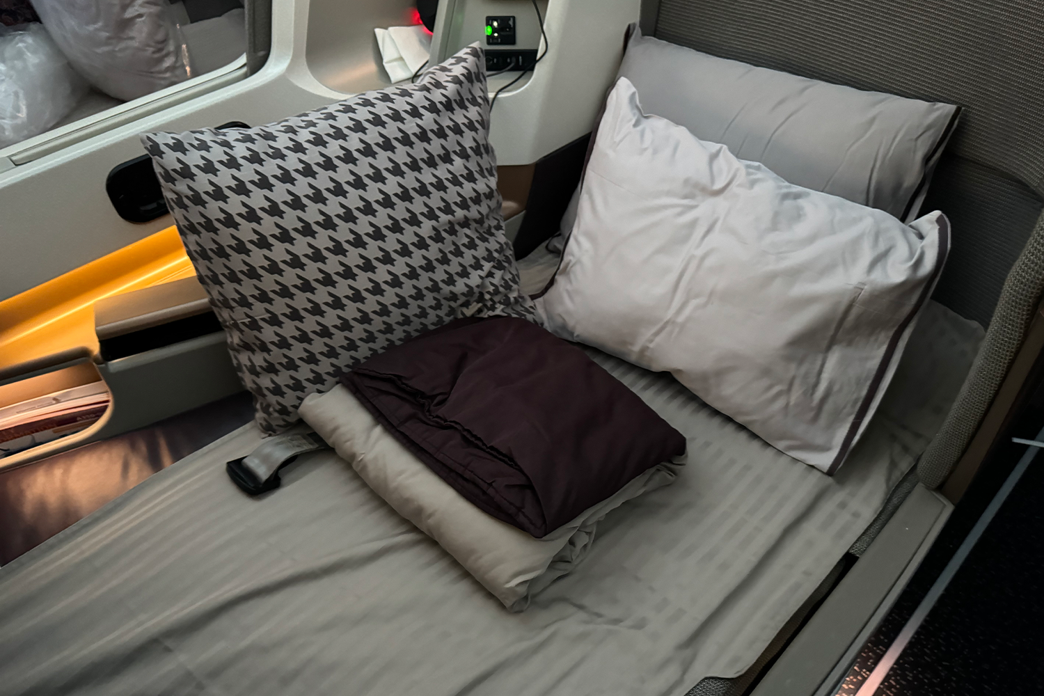 5:52 p.m.: Flight attendants are coming up and down the aisles, seeing if passengers are ready for bed. Unlike many other lie-flat products, Singapore’s seat doesn’t simply recline all the way down with a push button; the cabin crew physically converts it into a bed measuring a whopping six-and-a-half feet long.