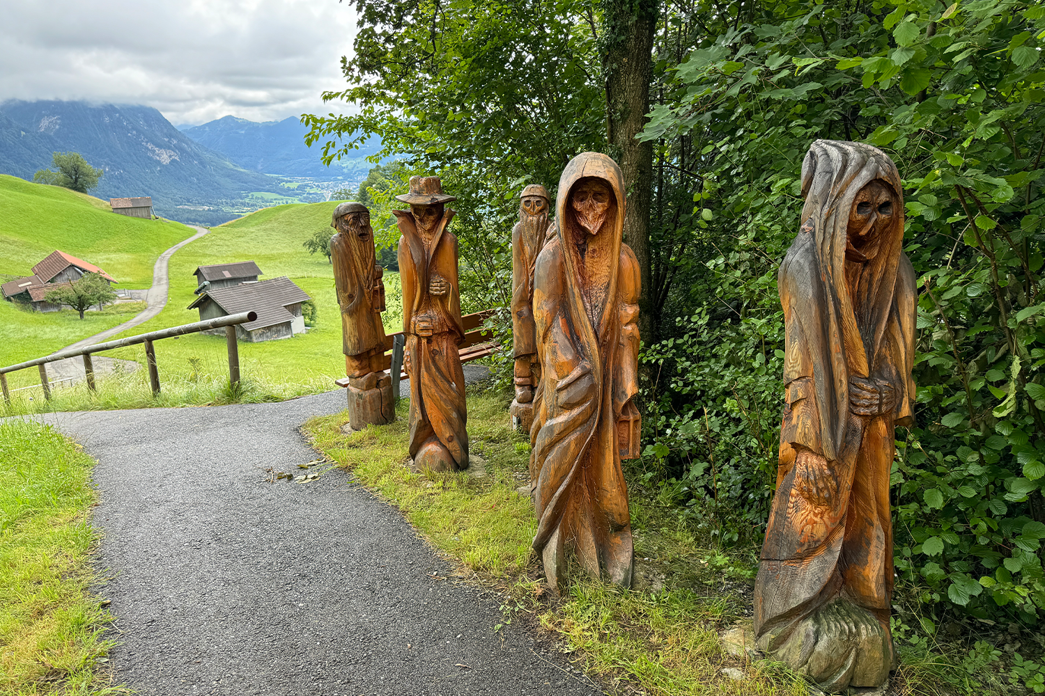 As beautiful as the scenery was, it hasn’t always been so welcoming. The Walser people, a Germanic tribe that has lived here since the 1300s, considered the woods menacing. The next day’s hike led through thick larch and pine forests, passing creepy wooden statues of monsters and lost souls. Trailside signs recounted folk tales filled with witches, ghosts and fairy people.