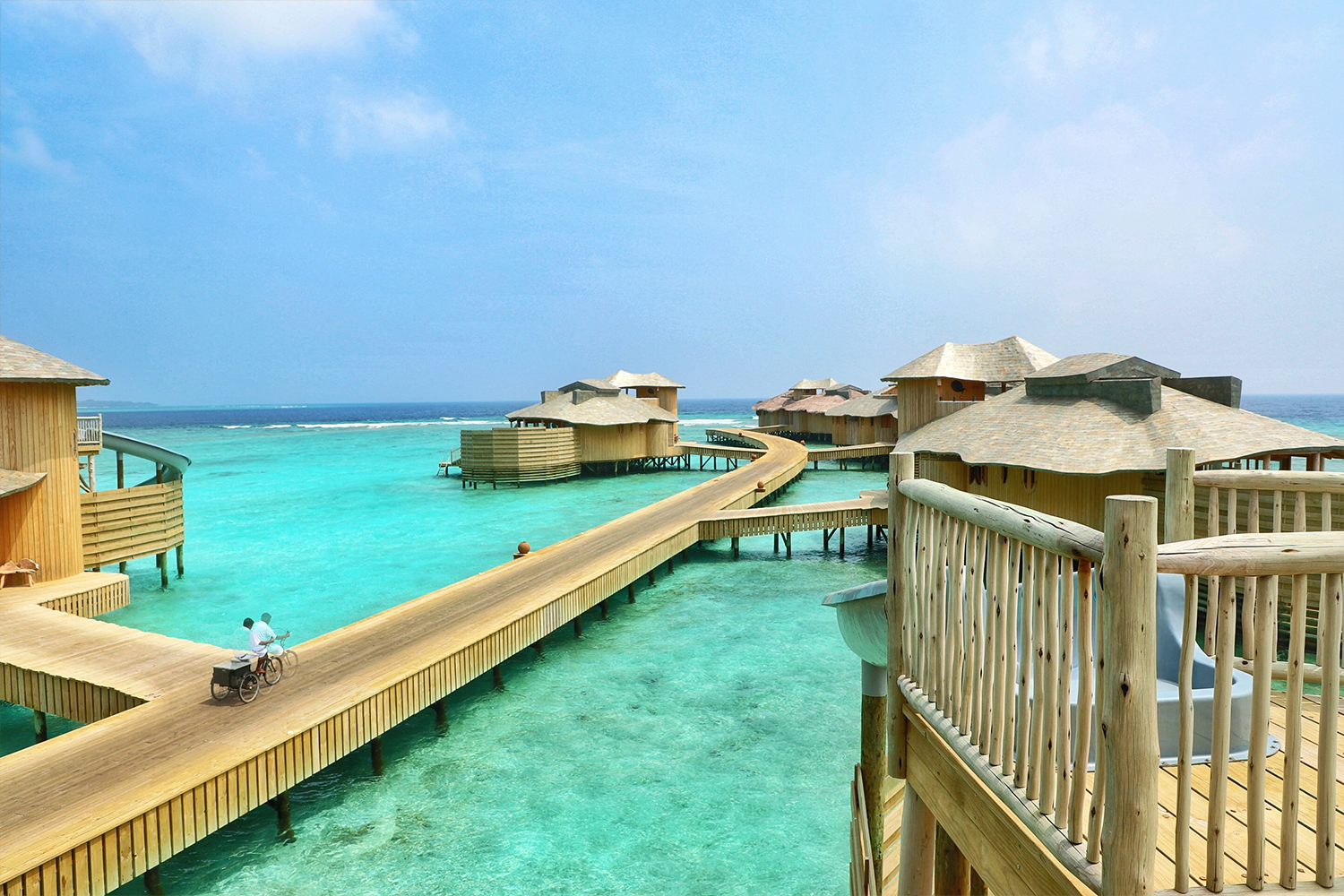 Whereas Soneva Fushi has the feel of a castaway-style resort based on its island, Soneva Jani, opened in 2016, is set in the otherworldly lagoon aquas of the Noonu Atoll. The resort is ensconced in water so clear and violently blue that descriptors fail to do it justice. The overwater villas are connected by a single serpentine boardwalk and come with the same sensational, show-stopping features: the waterslide, the outdoor bathrooms, the retractable roof. A second string of villas at the opposite end of its island opened at the turn of the year, with 27 new entrants doubling the resort’s capacity.