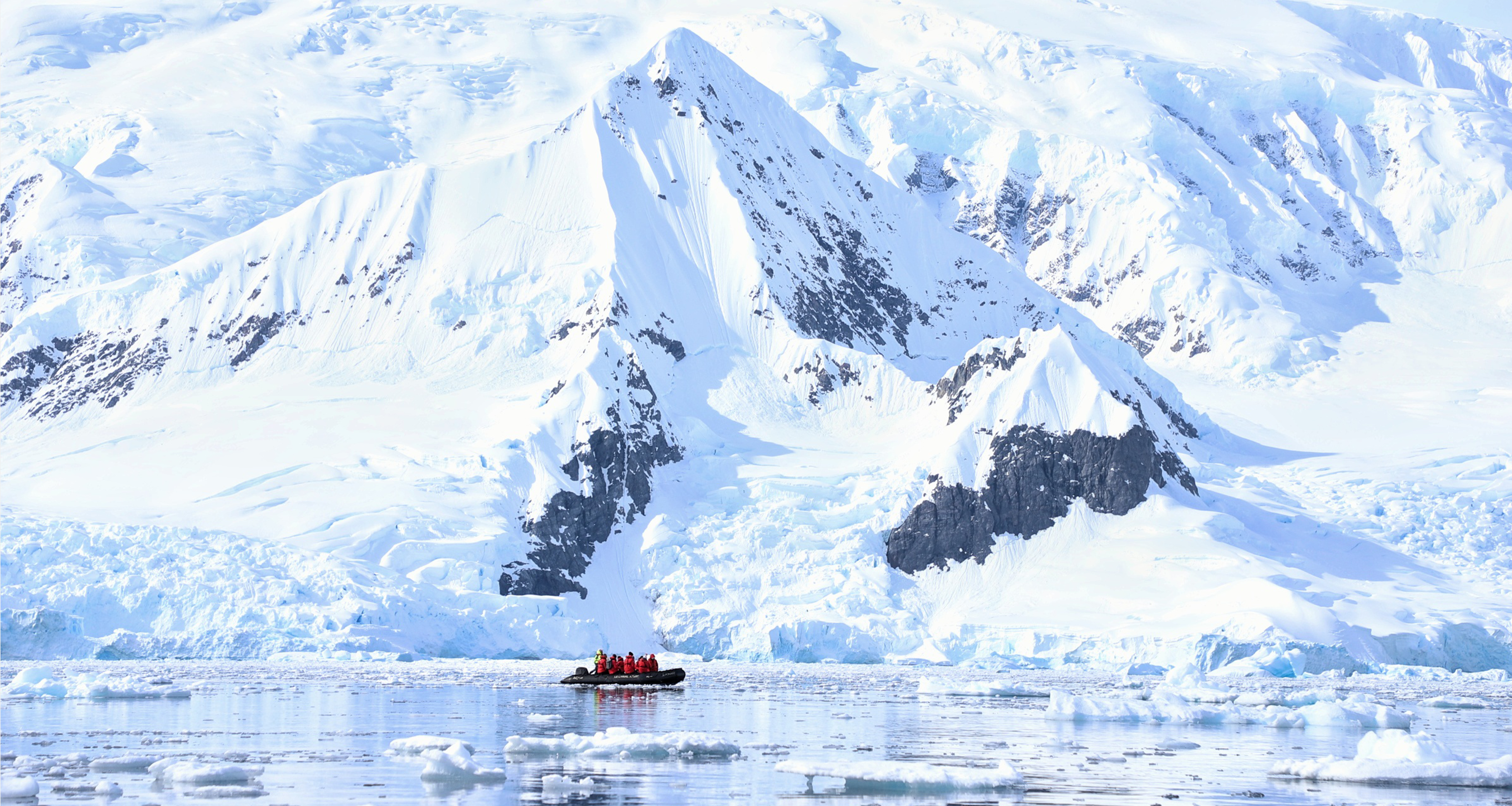 A Zodiac boat from travel company Abercrombie & Kent ferrying travelers past mountains and icebergs during an Antarctica cruise