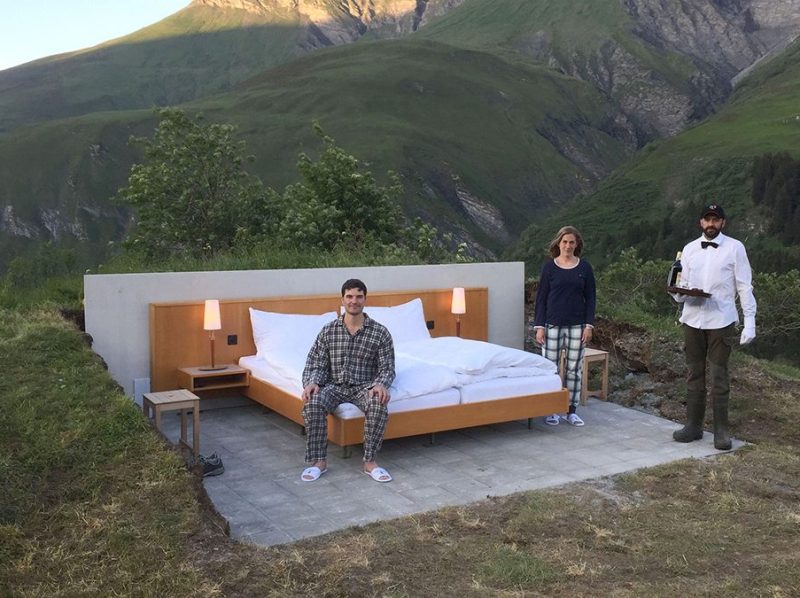 The hotel is located in Safiental, Switzerland, in a corner of the Swiss Alps. It consists of an open-air double bed, some bedside lamps, and little else, apart from a “modern butler,” complete with white gloves and a bow tie. Even though you won’t have a roof over your head, you will get a welcome drink and small breakfast basket. (It’s also unclear how you get there, but it shouldn’t be a problem parking your Falcon 8X at Lugano Airport.)