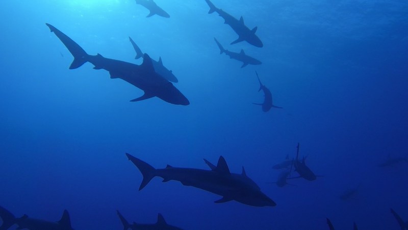 Sharky indeed. The area is home to 11 species of sharks. Whale sharks (mostly pregnant females), Galapagos, silky, white tip, black tip, silver tip, tiger, scalloped hammerheads and threshers are the nine species you encounter most often. Humpback whales arrive in winter, December to April, and sometimes orcas make an appearance simultaneously to stalk the calves.