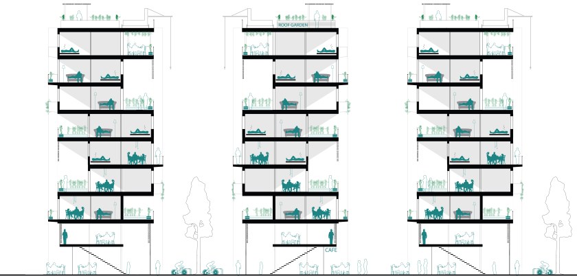 The building’s deep overhangs would provide necessary shade with the living space situated to receive plenty of sunlight. On the ground floor, units could be converted into communal facilities or areas for larger gatherings to foster a sense of community.