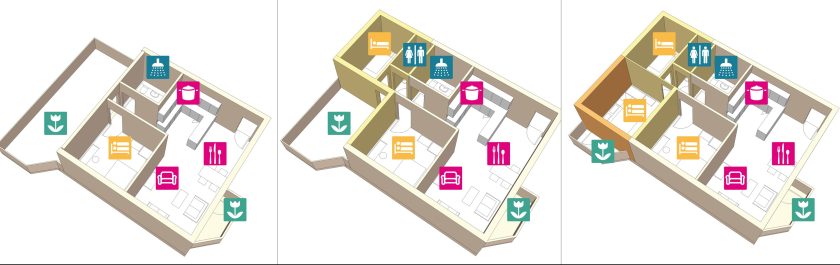 Weston Williamson + Partners (WW+P) designed an apartment with built-in space so it can expand incrementally as the resident’s wealth accumulates. The architecture firm used data collected from World Bank and Office of the Quartet surveys to provide people with long-term homes that they want. Each unit would be catered to different-sized families, ranging from one to three bedrooms, in flexible, but segregated spaces (see floor plans below).