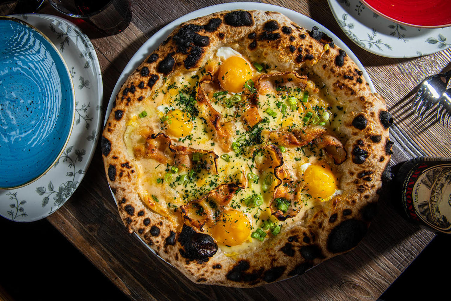 You’re dining on… pizzas ranging from the kinda-classic Margherita Rivisitata with passata and two kinds of mozz to a carbonara pie with pecorino cream and guanciale. More adventurous diners can feast both eyes and palate on the Lupo Marino: a squid ink-infused base topped with dashi tomato sauce, calamari, prawns and mussels. Or opt for the Manzo e Formaggio, an Irish-Italian fusion pie (yeah, you read that right) made with corned beef, fontina, peppers, onions and Dijonnaise. The menu also features some intriguing small plates and panuozzo sandwiches. For dessert, dig into a pizza bedecked with Nutella, berries and baby marshmallows.