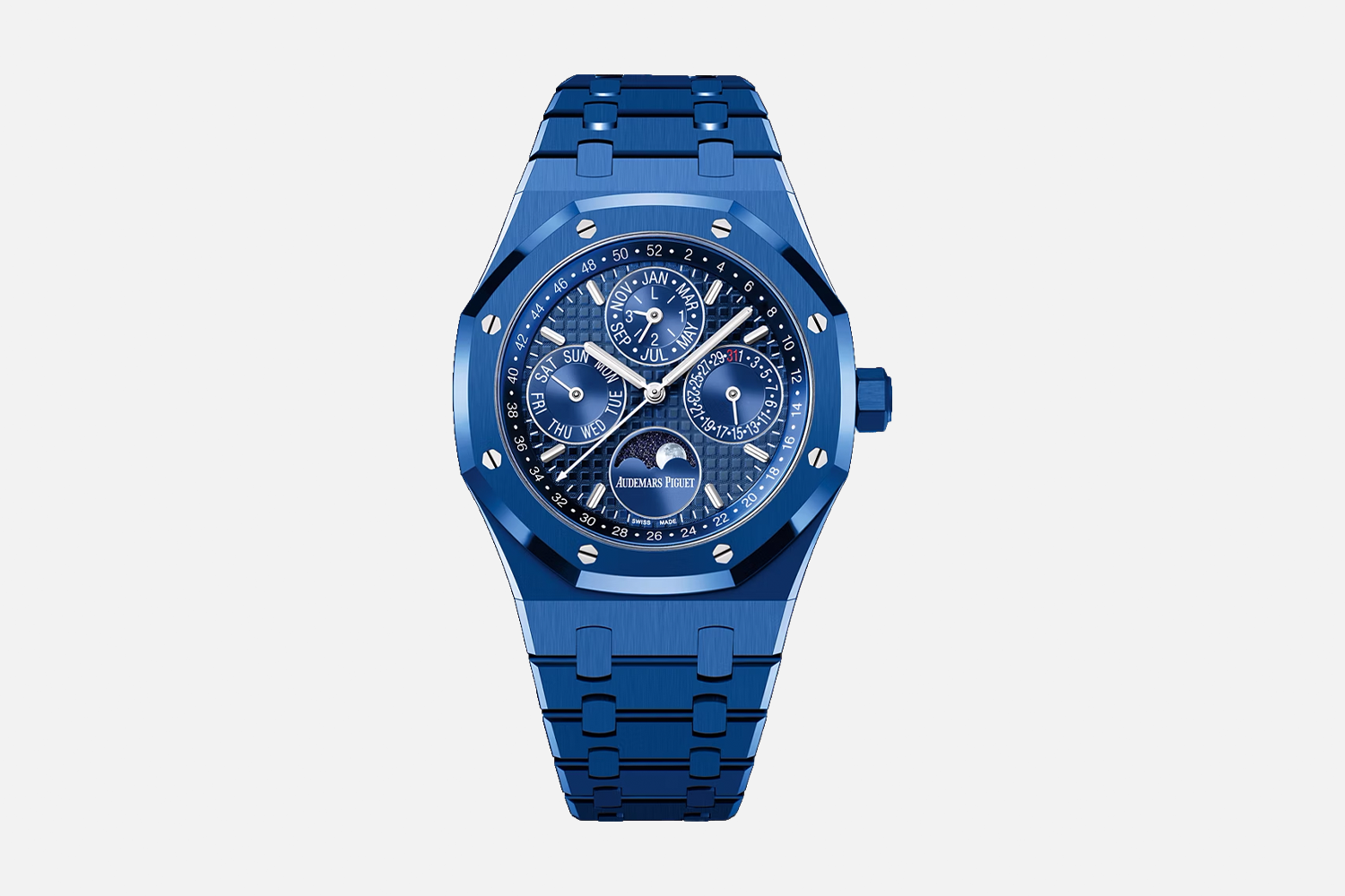 If you’re on the hunt for the ultimate combination of ceramics and haute horlogerie, then this Audemars Piguet Royal Oak Perpetual Calendar — with its stunning, ocean-blue case and dial — is the watch for you. Its famed Grand Tapisserie pattern is overlaid with an elegant calendar display, while its integrated bracelet is fitted with a folding clasp in blackened polished steel. Measuring just 9.5mm thick, it’s one of the best expressions of colored ceramics in fine watchmaking available today.