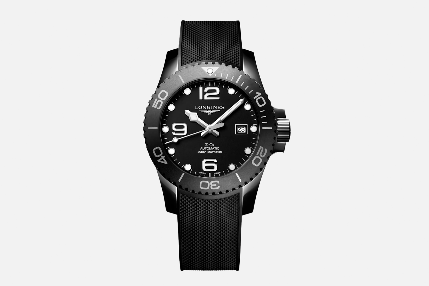 Swatch Group-owned Longines makes a Hydroconquest — its good-looking, highly robust dive watch — in a wide array of colors and sizes. This particular version switches out the more typical stainless steel housing for a black ceramic case boasting monochromatic looks and 300m of water resistance. With its matte black bezel and matching black rubber strap, it makes for a stealthy sports watch that’ll fly right under the radar.