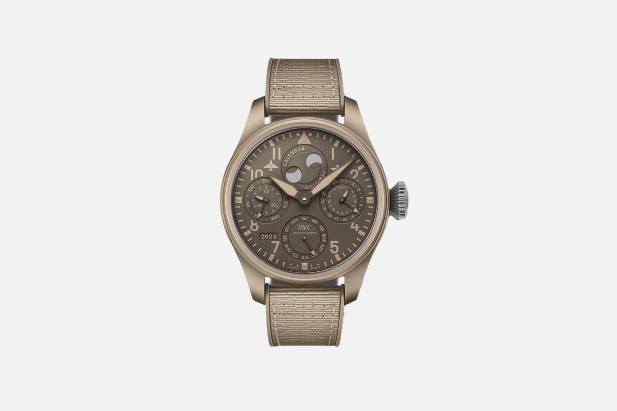 Leave it to the International Watch Company to combine a hard-wearing, desert-colored ceramic case with a military-inspired dial that also includes a perpetual calendar display with double moon phases. Looking like a piece of milspec kit issued to a Swiss special operations unit, it’s simultaneously extravagant and incredible. Inspired by China Lake — where U.S. naval aviation trains its pilots in the Mojave Desert — it’s programmed to keep the correct day, date, month, year and moon phase until the year 2100.