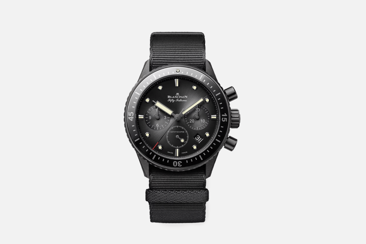 Though the Blancpain Fifty Fathoms was one of the world’s first serially-produced, commercially-available dive watches, its more modern executions are equally as exciting as the vintage ‘50s gems. Take the Fifty Fathoms Bathyscaphe Chronograph Flyback, for example: no slouch of a timepiece at 43.6mm, its triple-register chronograph display with 30-minute and 12-hour counters features flyback capability, while its matte black ceramic case is water resistant to 300m.