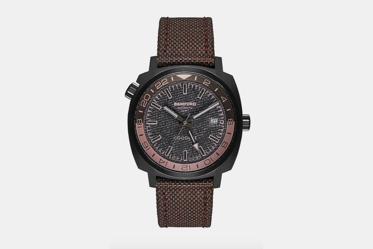 George Bamford is no stranger to great watches, as his Bamford Watch Department has been customizing high-end timepieces to customer’s unique specifications for years, but his foray into producing his own watches has been much more recent. This year saw the introduction of the Bamford London GMT, a watch the bulldozer scion says was inspired by his own travel needs. The “retro-future” design harkens back to some of the great watches of the sixties, with details like a cushion case and concave dial. As with Bamford’s previous watch, the Mayfair, the GMT came in a number of limited edition colorways and collaborations. Our favorite is with NYC based clothing brand Goodlife, whose GMT collab honors their first foray into denim shirting. It’s available in two colors, both sporting denim texture dials and actual optional denim straps. The first is a matte black case with espresso accents and the second is the very 2020 white and navy with a washed indigo strap and dial.