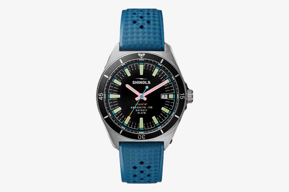 Frankly, this affordable, 40mm skin diver from Shinola might be one of the coolest sub-$1,000 watches of the year — and an excellent potential gift. Available in four rad colorways, it takes the form of a vintage-inspired dive watch in stainless steel with short lugs, no crown guards and a unidirectional dive bezel with a thin insert. Beneath a sapphire crystal is a cool, colorful dial in either black, canary yellow, blue, or black with pink accents, each of which features an eye-catching set of bi-color indices combined with an inner minute track and a colored central seconds hand. Powered by the reliable Shinola Argonite 715 Quartz and paired to a rubber Tropic-style dive strap, it’s water resistant to 100m and also features a date window.