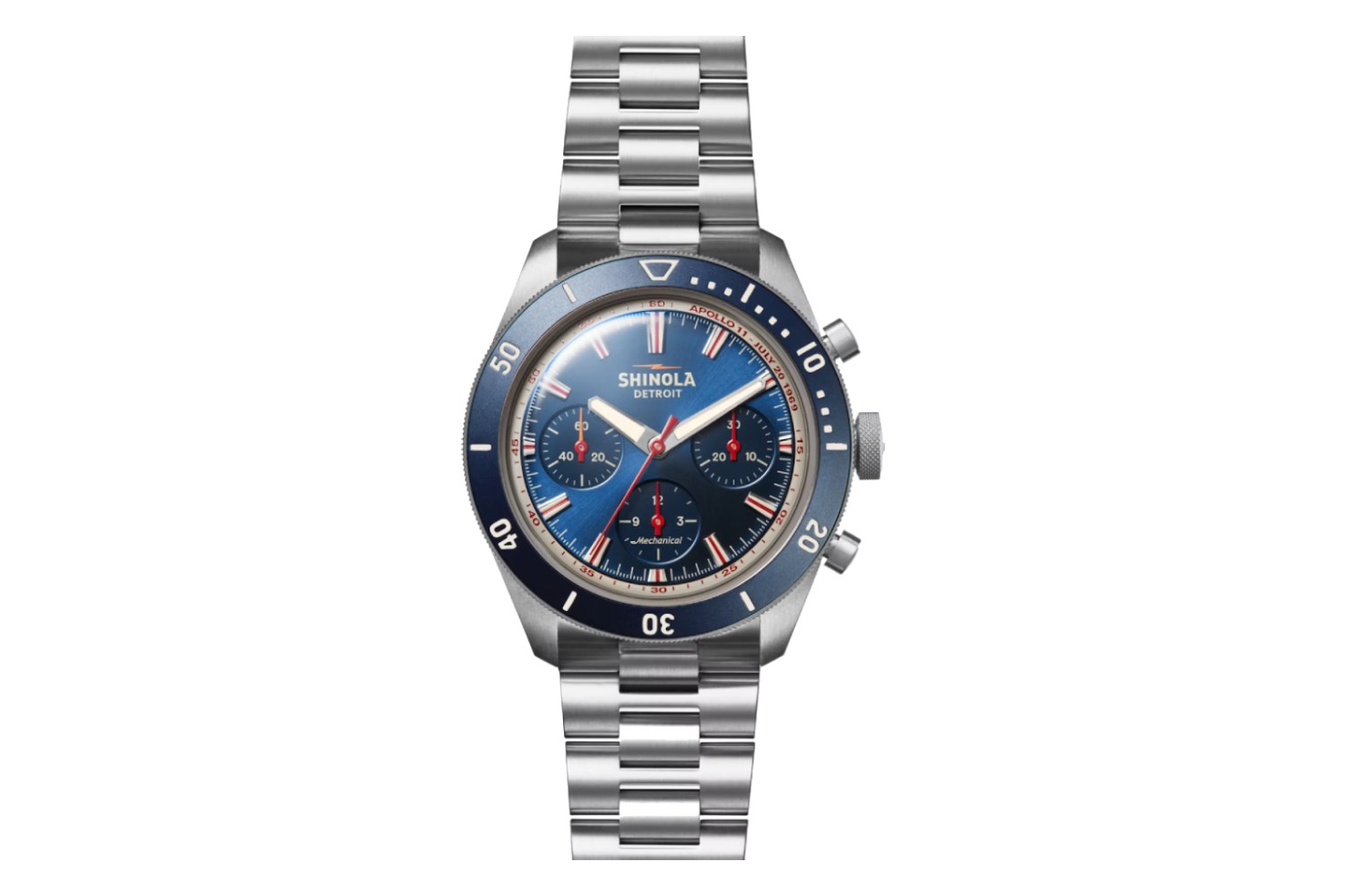 Shinola’s first manually-wound chronograph celebrates Detroit’s contributions to the space race. Clocking in at 43mm, this robust (but lightweight) titanium chronograph is full of colorful touches: The matte blue dial has welcome pops of red and white in the form of applied indices, a triple-register chronograph readout, a sword handset and a white-and-red 60-minute track. Powered by the hand-wound Sellita SW510 M b movement and paired to a matching titanium multi-link bracelet, it features an exhibition caseback to show off its inner workings.