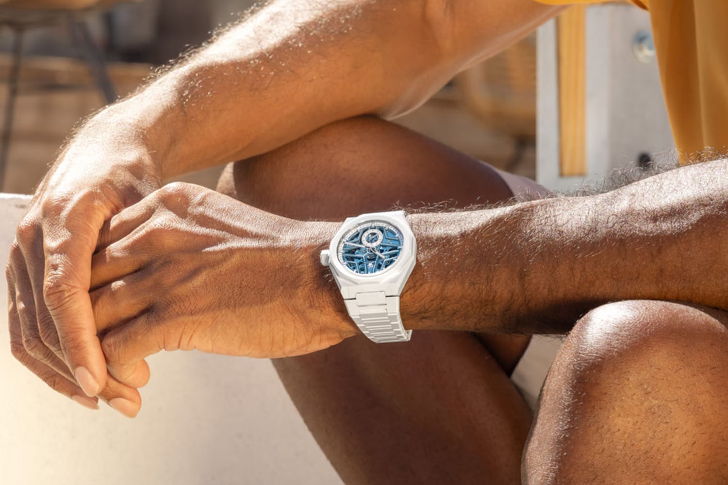 The third and final edition stemming from the partnership between Australian watch authority Time+Tide and LVMH-owned maison Zenith, the new Defy Skyline Skeleton White Surfer Ceramic is yet another handsome, summery timepiece constructed of high-tech materials and fitted with an undeniably cool movement that’s sure to excite serious watch heads. At 41mm in white ceramic, it features an integrated, matching bracelet and an included white rubber strap. The El Primero 3620 SK automatic movement ticking away within, which beats at a frequency of 36,000 vph and is visible via a blue-gradient openworked dial, boasts bridges in the form of Zenith’s famed star logo as well as a star-shaped winding rotor.