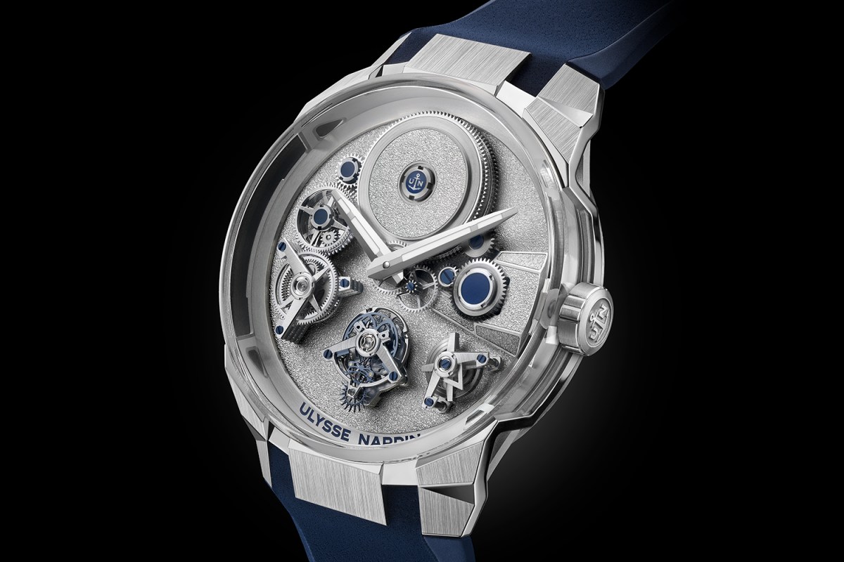 Ulysse Nardin is no stranger to innovative movement designs and avant-garde aesthetics. Having debuted the Freak in 2001, the brand continues to push the envelope in each model it develops. The new Blast Free Wheel Maillechort features a dial machined from maillechort, an alloy of copper, zinc and nickel whose raised texture brings dimension and depth to the watch’s design. At 6 o’clock is the brand’s award-winning flying tourbillon design with Ulysse Anchor Constant Escapement, while at 12 o’clock is a floating double-barrel system that appears suspended in midair. Providing the watch with seven days’ worth of power reserve — which is tracked via a unique power-reserve display at 4 o’clock — the watch’s fascinating movement is housed within a 45mm white-gold case and paired to a waterproof blue velvet-effect rubber strap.