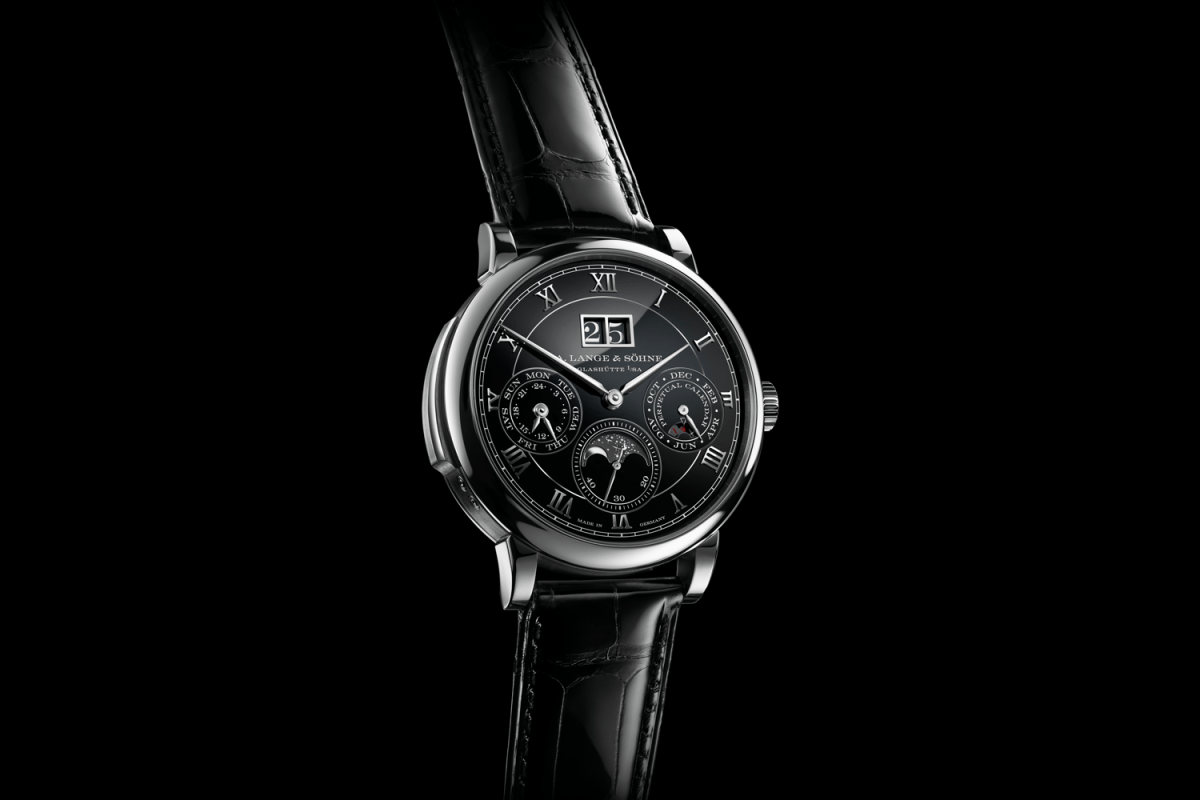 Adding to its stable of complicated watches with repeater functions (the Zeitwerk Minute Repeater, the Richard Lange Minute Repeater and the Grand Complication), A. Lange & Söhne is introducing a new chiming watch combined with a perpetual calendar. The Minute Repeater Perpetual (Ref. 607.091FE), housed in a 40.5mm platinum case, features a classically-inspired, black-enameled gold dial with a white Roman-numeral hour indices; an outer railroad minute track; an outsize date display at 12 o’clock; and calendar displays at 3, 6, and 9 o’clock. A slider on the left-hand case flank controls the minute repeater function, which is powered by the new hand-wound Cal. L122.2 movement. Exquisite in typical Lange fashion, it won’t be around long — limited to just 50 pieces, it’s sure to be snapped up by eager collectors.