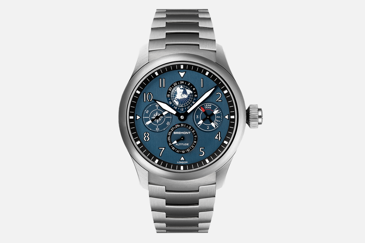 Bremont has significantly revamped its offering under the leadership of CEO Davide Carrato, who previously served stints at Movado, Tudor and elsewhere. The Altitude collection, which evolved from its famed MB (Martin Baker) series, includes all manner of aviation-themed timepieces, including a significant new development: The Altitude Perpetual Calendar is a giant leap forward in mechanical sophistication and offering. Housed in a 42mm titanium case, it maintains the overall collection’s aviation theme while offering a unique dial layout: At 12 o’clock is a domed globe that serves as a 24-hour indicator; at 9 o’clock is a running seconds indicator with a cool propeller hand; at 6 o’clock is a radial date indicator; and at 3 o’clock is a special combination leap year and month indicator. Nifty!