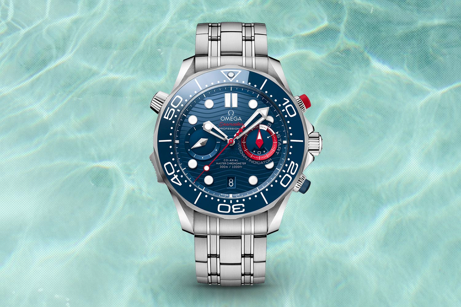 This burly 44mm Seamaster produced in celebration of the 36th edition of the America’s Cup features an impressive combination of assets that make it uniquely suited to yachting: water resistant to 300m, it has a dual-register chronograph with a countdown indicator that can be locked by the user to prevent accidental stopping/starting. Additionally, it sports a blue ceramic bezel ring with a conventional dive/timing scale, plus a stainless steel bracelet and, for good measure, a helium escape valve. Truly, this is a timepiece that can handle just about any aquatic activity one could conceivably throw at it.