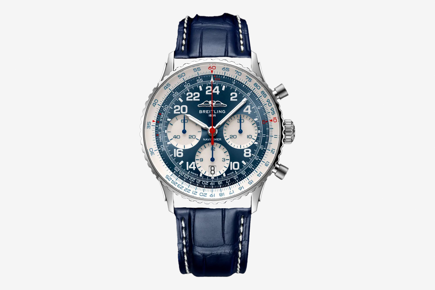 Like the original Cosmonaute prototype built for Carpenter, the dial features the AOPA (Aircraft Owners and Pilots Association) logo, Navitimer’s signature slide rule bezel for complex directional, speed and fuel consumption calculations, and three chronograph registers: at 3 o’clock is a 30-minute counter, at 6 o’clock is a 12-hour counter and at 9 o’clock is a running seconds display. In this instance, there’s also a discrete date window within the 6 o’clock counter with a matching white background disc. 24-hour indices in white pop against the blue background, while luminous sword hands and blue and red chronograph hands aid legibility.