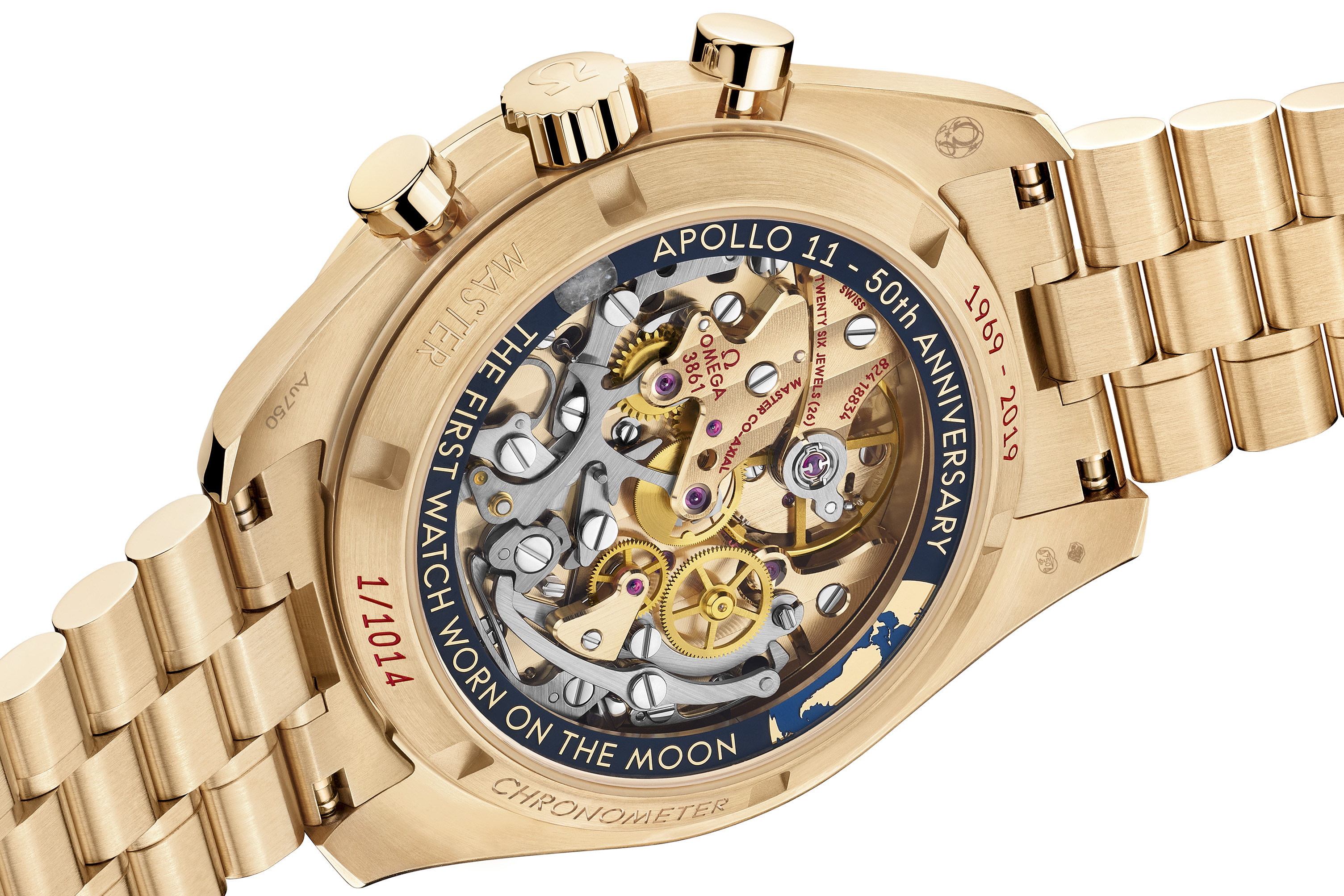 Not everyone can be an astronaut and experience the Moon for themselves, but the Speedmaster Apollo 11 features the next best thing: a lunar meteorite. Inlaid within the watch’s caseback is what appears to be a rendering of the Moon made out of a piece of a lunar meteorite, or a rock that ejected itself from the Moon and made its way to Earth..