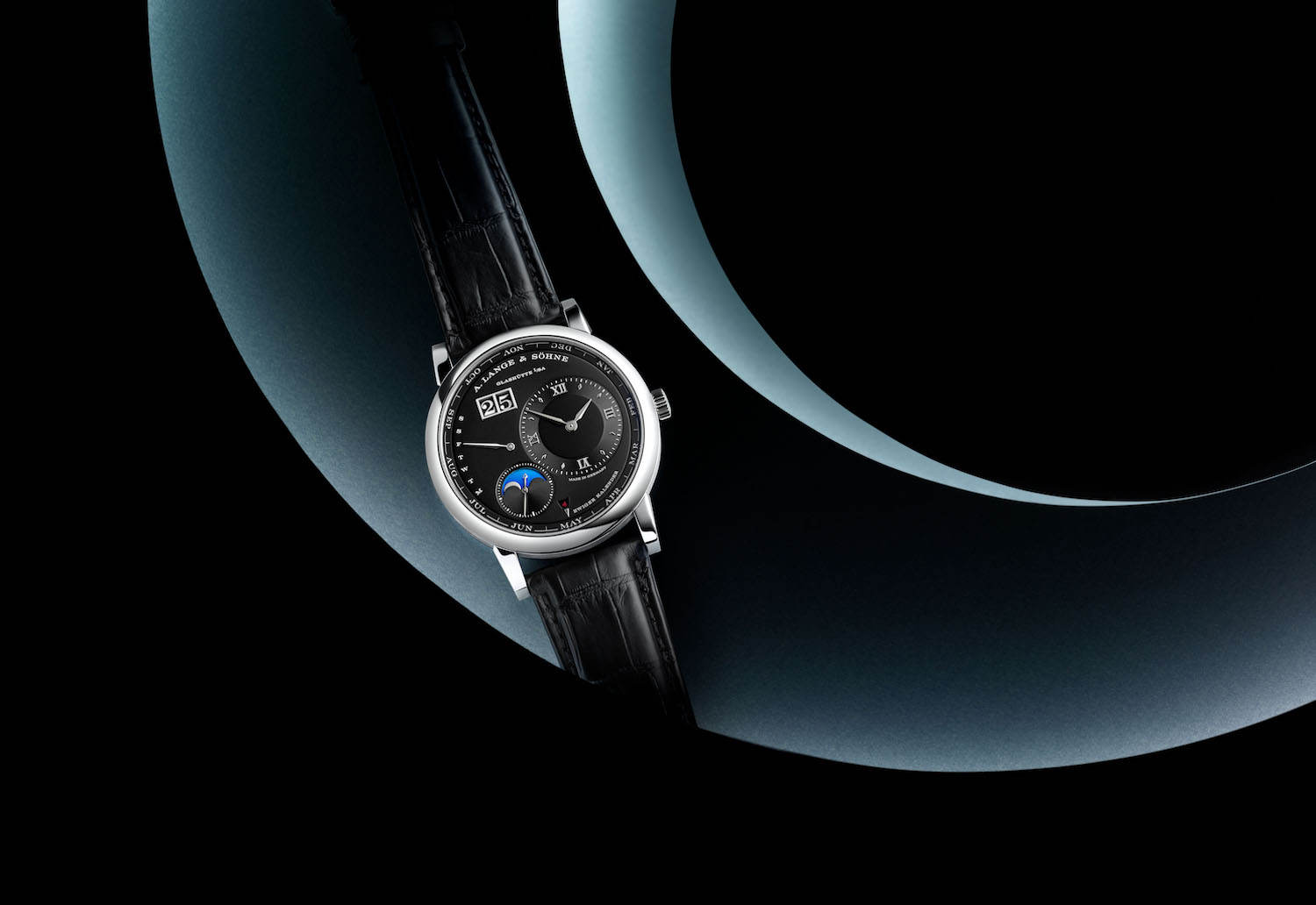 The months, meanwhile, are neatly relegated to the dial periphery in a ring that advances precisely 30 degrees every 28-31 days, depending upon the month. Regulated by a cam, this system advances the disc precisely at midnight on the last day of the month. In fact, the Calibre L021.3 automatic movement provides instantaneous advancement of all indicators via an elaborate system of parts — 621 of them, to be precise, as well as 63 jewels. Equipped with a 50-hour power reserve, it allows for individual adjustment of any of the watch’s functions via correctors set into the case.