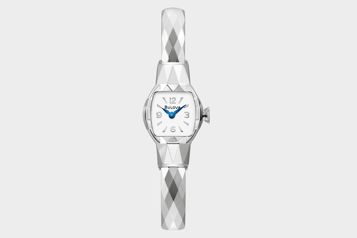 Bulova originally revived its American Girl series (no relation to the dolls), which were made in the 1930s through the ‘60s, because one was featured in The Queen’s Gambit. This edition, based on a design from 1957, includes striking blue hands in the middle of a white dial set in a fun faceted bangle.