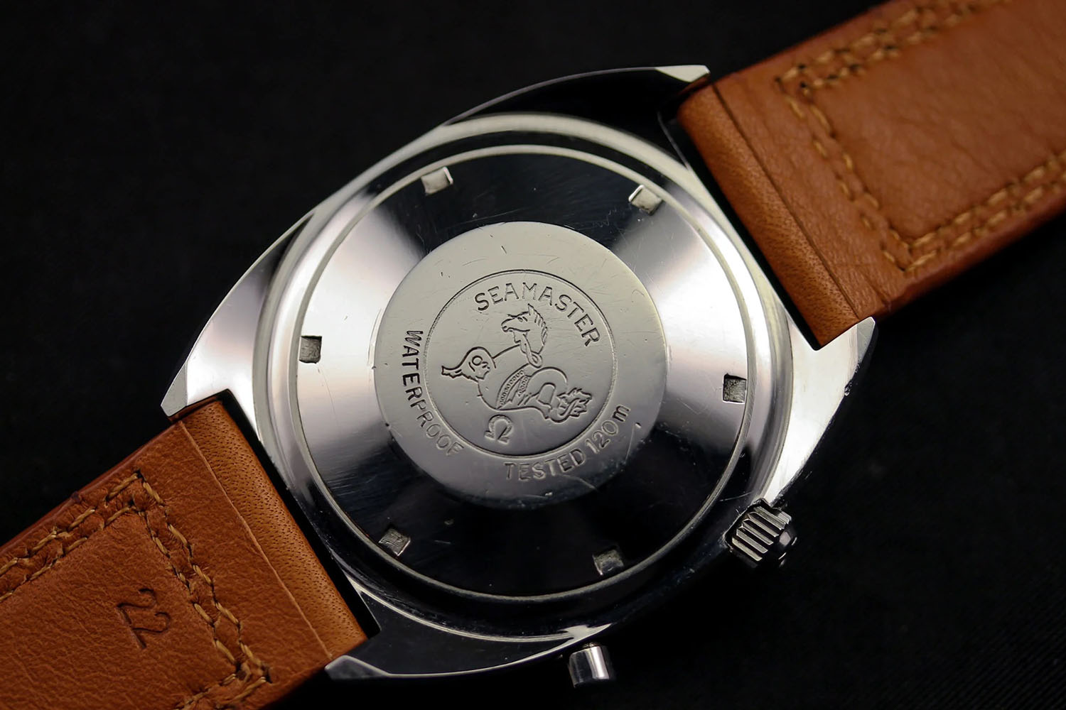 Funky ‘70s design sensibilities made themselves known, not only in case design, but also in bold use of color on the dials. Many of these are highly-saturated in blue, green, burgundy, grey, black and more, while others featured bright orange and yellow scales and inner bezels in contrasting shades that both increased legibility and also upped the “fun” factor for a younger clientele. 1/5th-seconds tracks were common to the Genève references, while Seamaster references contained one of numerous scales — tachymeter, pulsometer, decimal or telemeter — or even a rotating inner dive bezel. And while date-equipped versions sometimes featured stepped “pie-pan” dials, dateless references featured flat dials. Each date version also featured the “Omega” wordmark and central seconds hand in orange.