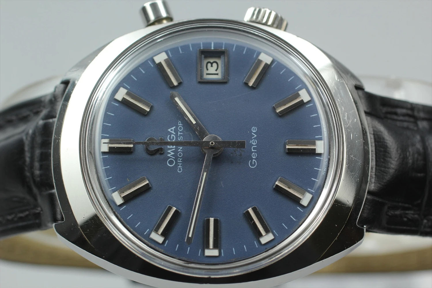 Each Genève Chronostop, regardless of reference number, featured a tonneau-shaped case with a signed, knurled crown without guards; a screw-down caseback; downward-sloping, radially-brushed bezel; slightly hooded, polished lugs; and a polished caseband. A special Japanese-market version, however, features a polished bezel to match its dressier, flat dial. Executed in white or blue, it withheld the 1/5th-second track in favor of applied indices, a sword or spear-tip seconds hand; an applied Omega logo; and an applied date window. Each of these Genève family Chronostops carried a factory water resistance rating of 30m and a lug width of 18mm.