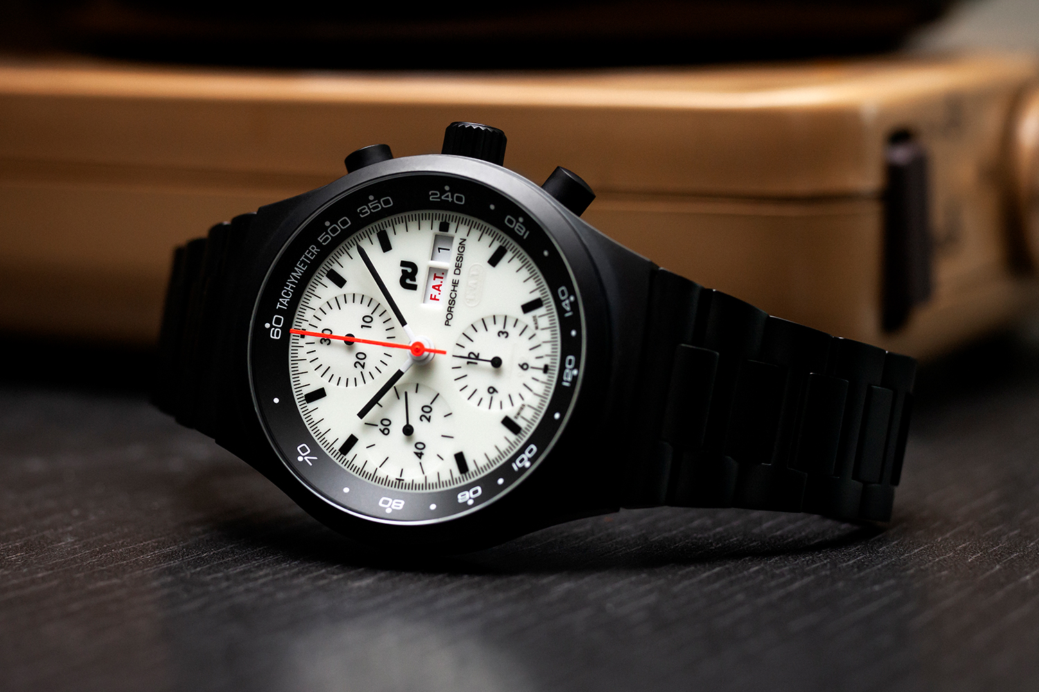 The glaring difference between the new F.A.T. 2025 Edition and past versions of the Chronograph 1 will no doubt be obvious: While the black case and bracelet have been maintained, this one features a white dial entirely coated in Super-LumiNova — which means the entire thing glows green in the dark. But there’s more to the dial than just the icy coloration: The English/German day-of-the-week indicator’s “SAT” and “SUN” positions have been replaced by “F.A.T,” while the F.A.T. logo is also subtly incorporated in white-on-white below the Porsche Design wordmark. Meanwhile, within the 12-hour counter at 6 o’clock — but only in the dark — is the silhouette of a Porsche 962, with the “6” in the hour counter forming the “6” in the model name. A bright orange seconds hand matches the font color on the F.A.T. logo within the day window, giving the dial a sharp pop of color.