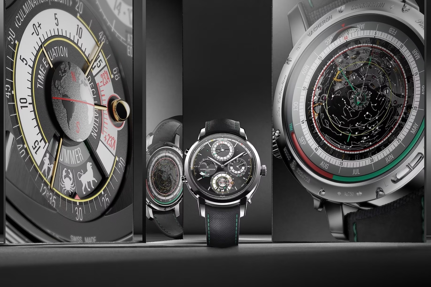 One might expect that a wristwatch fitting such a complicated description is all but illegible, but thankfully, this is most certainly not the case. Vacheron Constantin gave the Solaria a distinctly modern dial with color-coded componentry to help differentiate its numerous displays and complications. Featuring a black background with subdials and a luminescent sword handset, it’s surprisingly readable despite the wealth of information on offer. While each subdial combines multiple complications, there’s thankfully no need to break out a loupe to get your bearings — though whether you’ll actually be using the watch to calculate, say, “the time it takes for a constellation or a given star to appear centered in the observer’s field of vision” is up for debate.