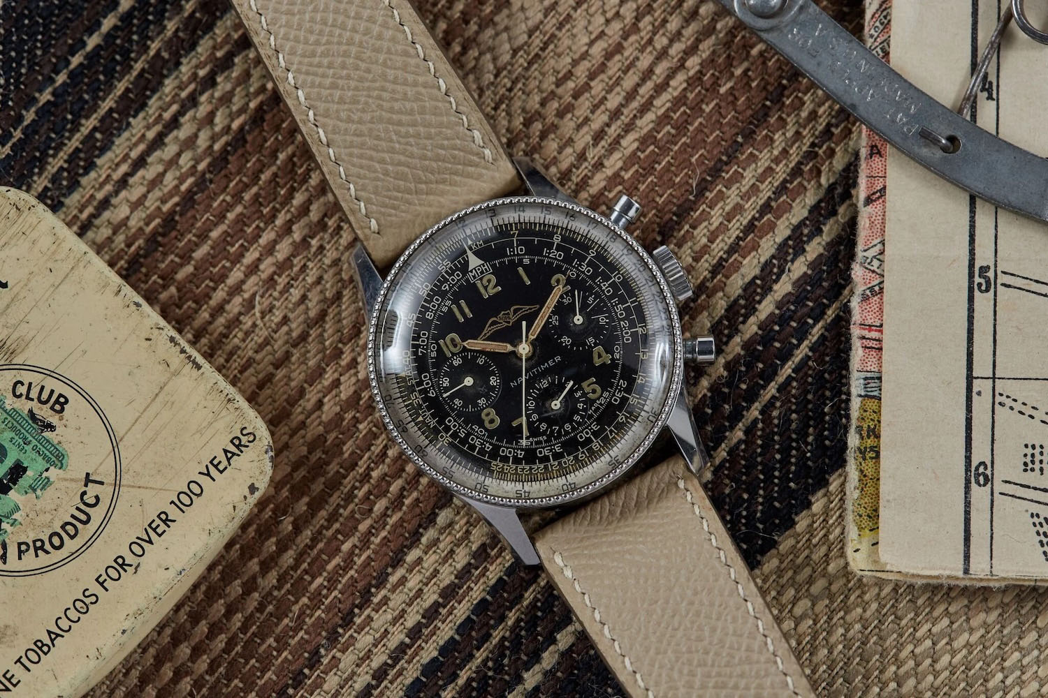 Developed for the U.S. Aircraft Owners and Pilots Association (AOPA), the original Navitimer paired the logarithmic slide rule of the brand’s Chronomat with a beaded bezel for easy manipulation, allowing pilots to calculate wind speed, fuel consumption and other crucial information. A 41mm stainless steel case ensured that the dial was large and legible enough to be read easily, while radium provided luminescence at night. Powered by a 17-jewel Venus movement and featuring 30-minute, 12-hour and running seconds registers, the dial was signed with the “AOPA” logo and was only distributed to AOPA members.