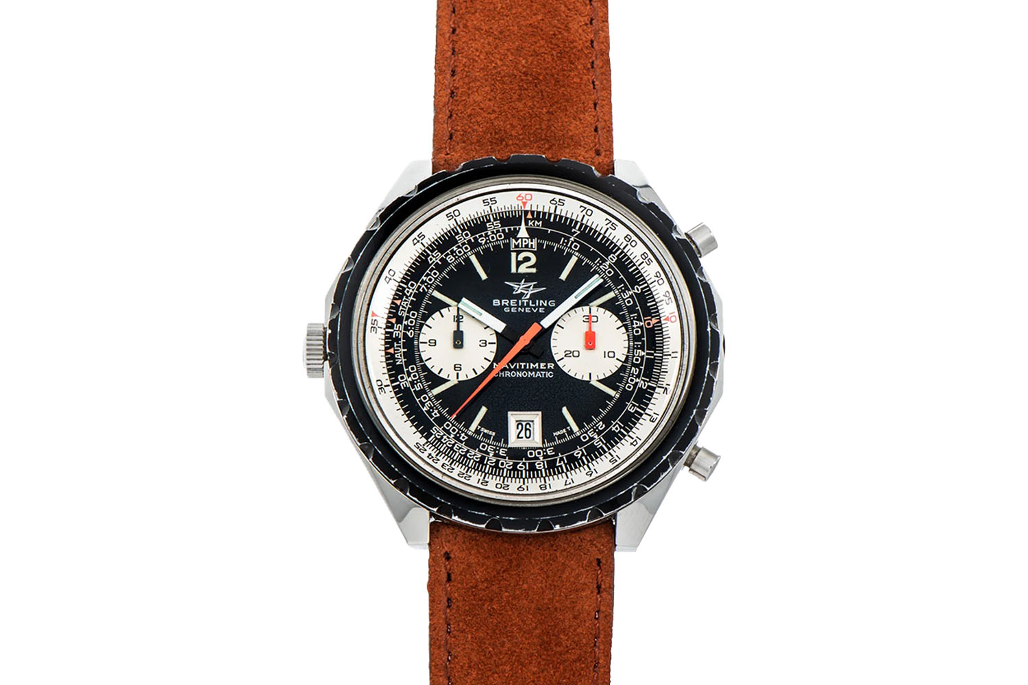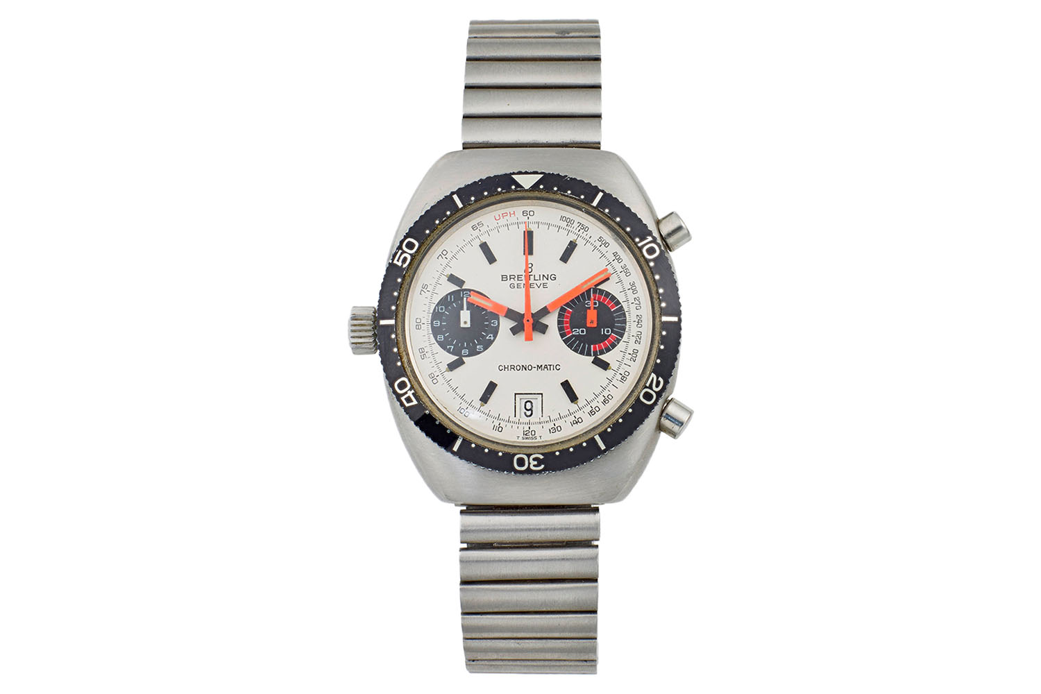 Part of the race to develop the world’s first automatic chronograph movement, Breitling partnered with Hamilton-Buren and Heuer-Leonidas in the design of the famed Calibre 11, which it introduced in 1969. This unique automatic movement — which featured a chronograph module superimposed atop an automatic base caliber — was quickly adopted to power multiple automatic Navitimers, both of which funkified the more reserved ‘50s original. The ref. 1806, a 47mm behemoth in stainless steel, features dual pump pushers on the right and a time-setting crown on the left. Its dial, covered in scales just like that of the ref. 806, features dual chronograph totalizers and a 6 o’clock date window.