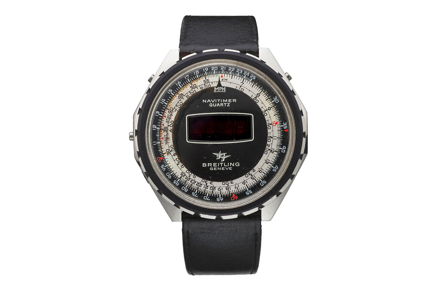 Breitling embraced the Quartz Crisis by simultaneously introducing both LCD and LED versions of the Navitimer. The ref. 9106 LED model, contained in a 49mm stainless steel case with a matching multi-link bracelet, featured the model family’s famous serrated bezel with multiple timing scales — in the center of the dial, however, was a rectangular LED screen in place of the analog model’s handset. In addition to displaying the time, it featured a chronograph function, date function and a split/lap time function. When combined with the computational bezel, the Navitimer Quartz could be used to calculate a wide variety of everyday tasks.