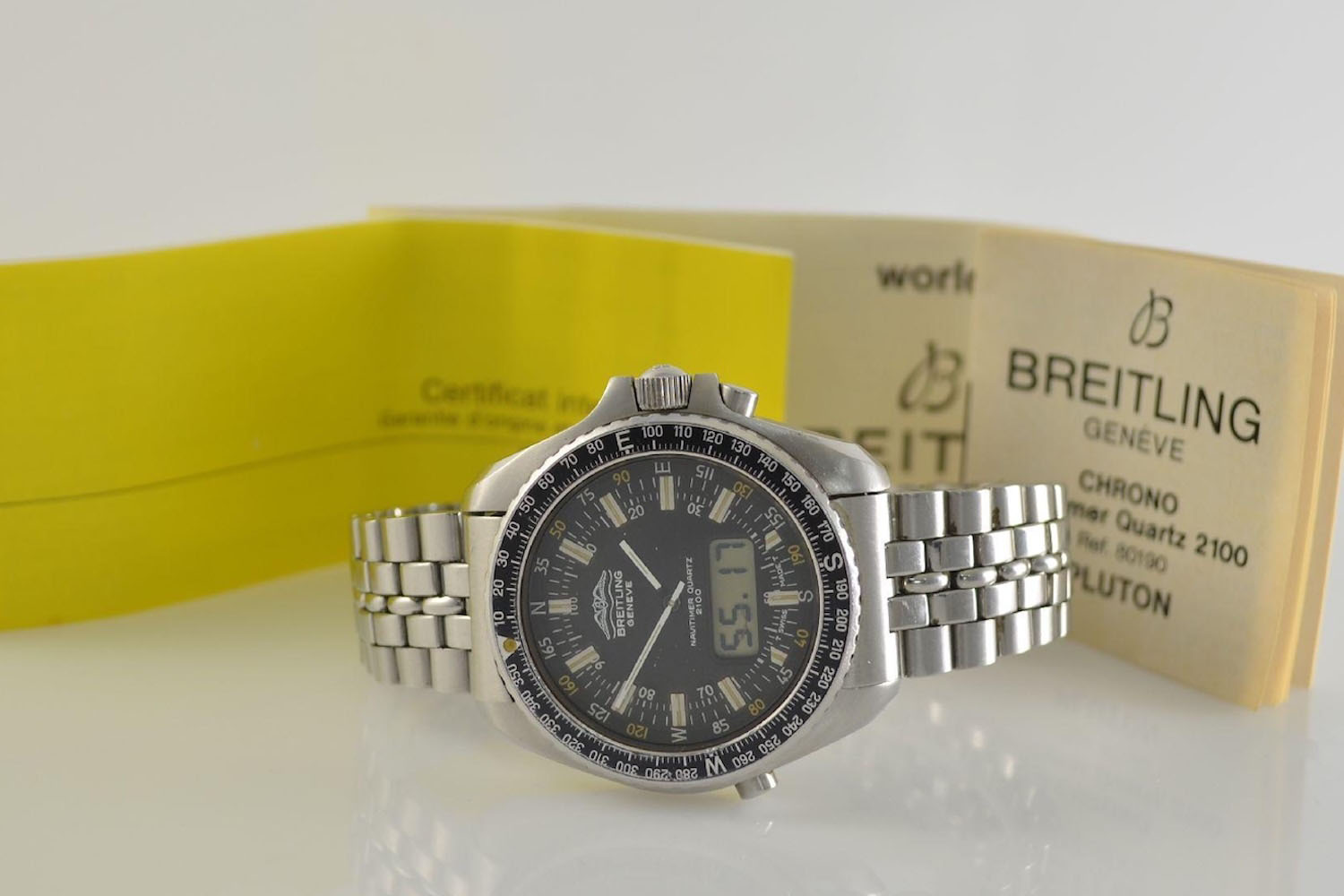 In 1980, Breitling introduced the Pluton ref. 80190, an “ana-digi” watch combining both an analog time display with an LCD readout. Housed in a chunky, polished steel case with crown guards, 4 and 8 o’clock pushers and a compass bezel, it mixed vintage Navitimer inspiration with the then-novel idea of an LCD screen: Around the periphery, the compass headings and a decimal scale allowed for on-the-fly calculations, while luminous applied indices, a baton handset and the aforementioned LCD readout above 6 o’clock provided a manner of different timekeeping functions.