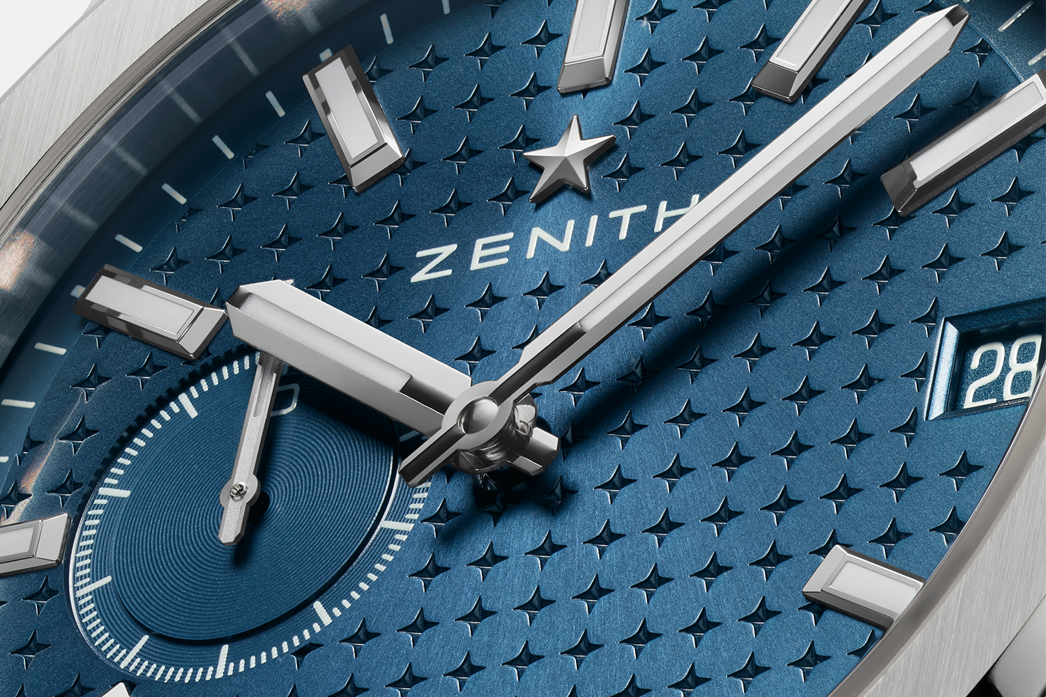 In that regard, the first thing you’ll notice when leaning into the watch face is that the pattern covering the dial is a repeating four-pointed star, a refashioned version of Zenith’s “double Z” logo that’s punched into the dial. The celestial aesthetic is highlighted through a sunburst finish, and more texture is added through concentric circle detailing on the seconds sub-dial. Zoom out a little bit and you’ll notice the eight-sided case against a 12-sided bezel, with a polished bevel, a design that recalls the extravagant Audemars Piguet Royal Oak. Lest you think there is some copycatting afoot, Zenith is drawing inspiration here from their vintage Defy models that came before that particular icon.