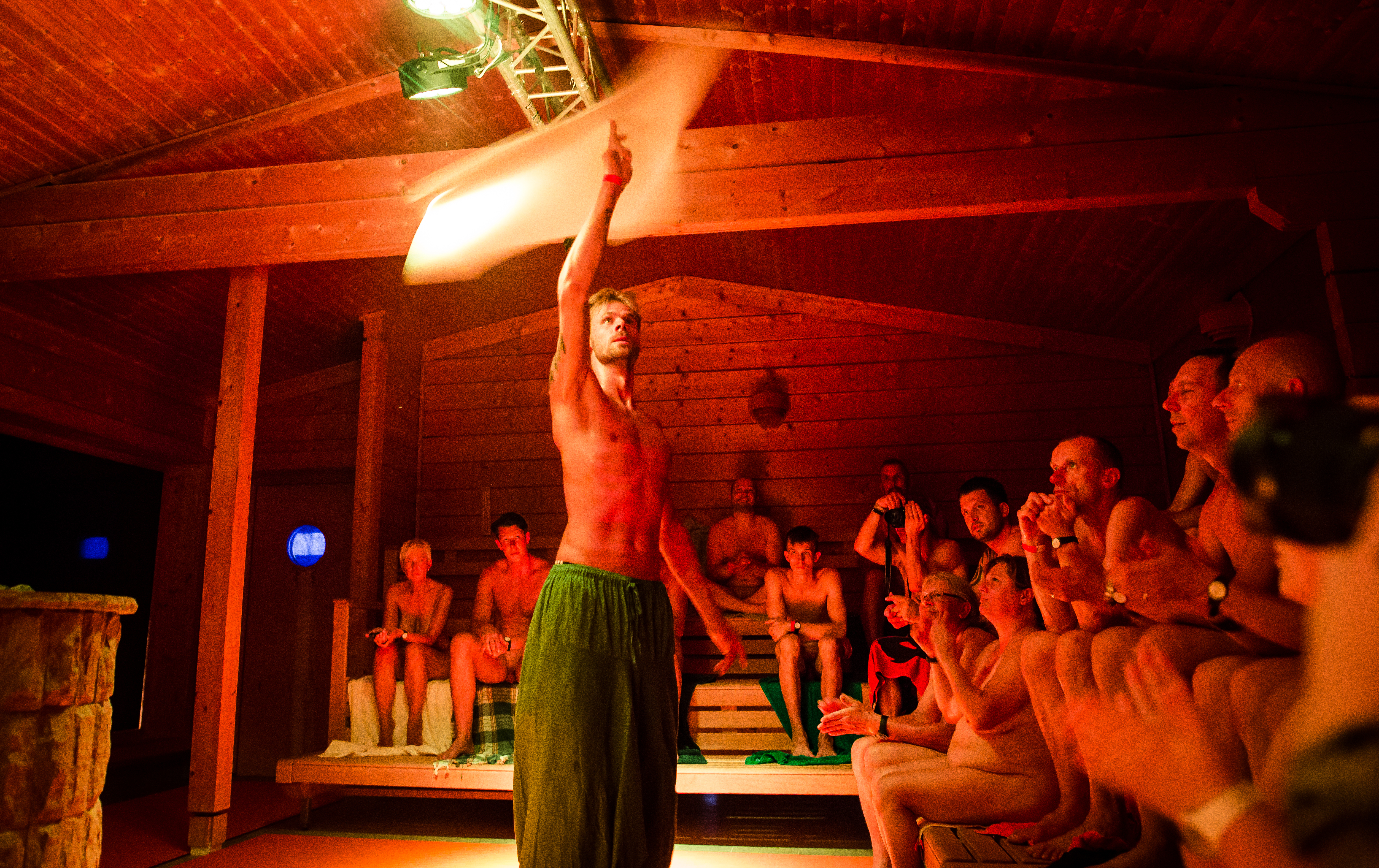 “Just kidding,” he added, getting a laugh from our group of 25, most of us sitting cross-legged in bathing suits or bikinis. Finally, the stinger: “It’s actually just a one-day streak. Let’s have a great sweat…and a good time.” He launched the towel into the 170°F air, whipping warm wind into every corner of the subterranean sauna. The terrycloth danced from his knuckles to his elbows, sometimes lurching dangerously close to the foreheads of those in the front row, though never actually lashing someone in the face.