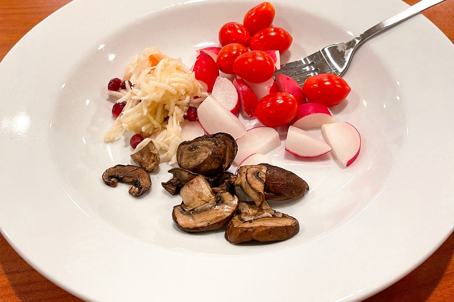 I went to the dining hall at 4:45, eager for a small plate of raw radishes, mushrooms, cherry tomatoes and a little slaw. Incredible, five stars! It’s astounding how quickly tastebuds and cravings can be recalibrated, and the most basic foods become as thrilling and exotic as the first time you had them as a toddler.