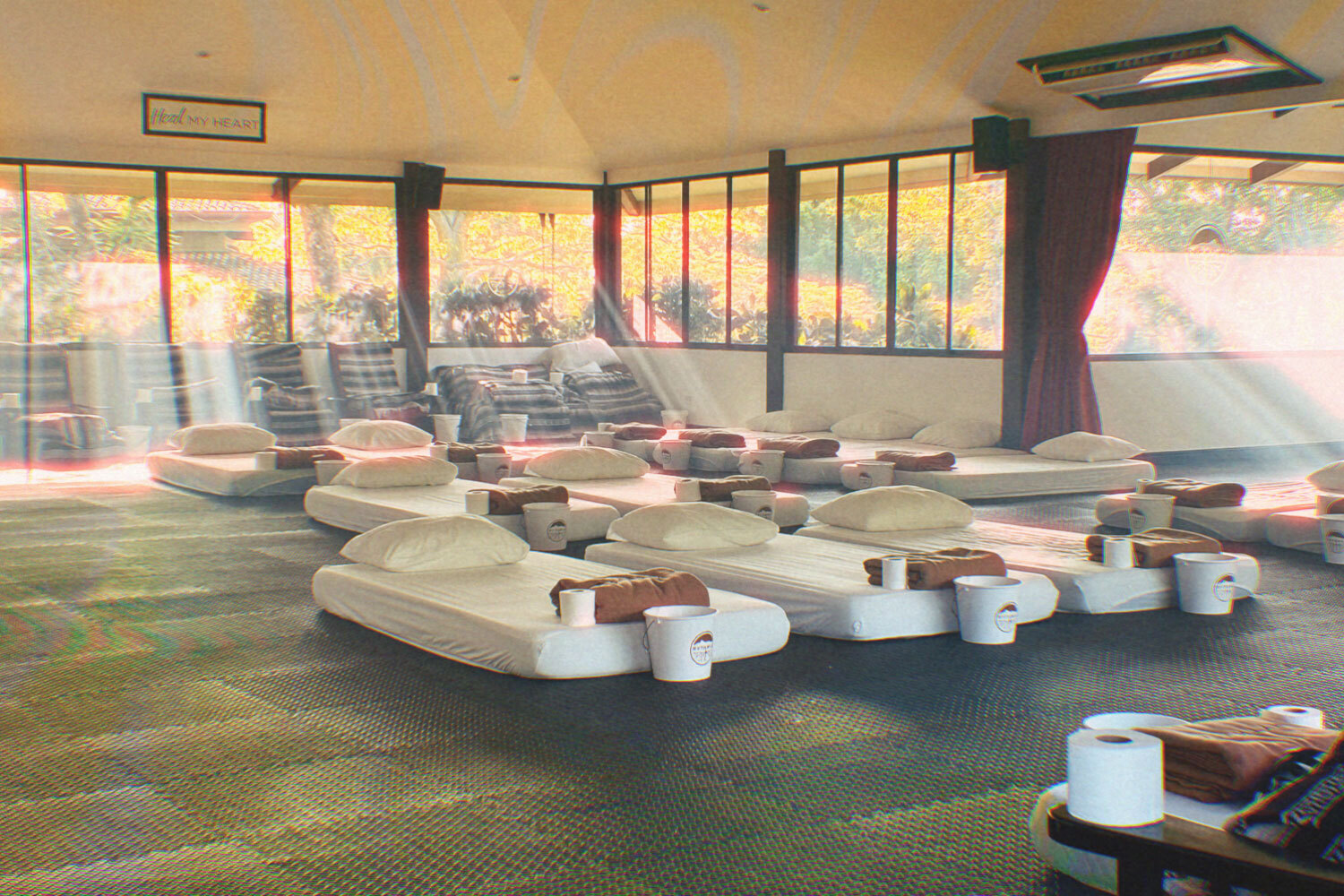 Inside, we each found a space with our own neatly organized mattress, pillow, eye mask, blanket and plastic purge bucket. The bucket reminded me of something you might take trick or treating, which felt both ironic and on point. We were given the logistics of how to behave. Noble silence is observed. We were not allowed to speak or touch each other so everyone could process in a safe and silent space. Most importantly, we were told the location of all the bathrooms.